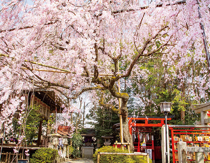 まず訪れるのは妙蓮寺。日蓮上人が入滅した10月13日頃から咲き始める珍しい御会式桜(おえしきざくら)があり、散った桜を持ち帰ると恋が成就するとも言われている桜です。4月には染井吉野も咲き誇り、御会式桜と見事な共演が楽しめます。そして次に訪れたいのが、菅原道真を祭神とし日本最初の天満宮といわれる水火天満宮(すいかてんまんぐう)へ。地元の人に愛されている隠れた名刹で、境内を覆い尽くすほどの枝垂れ桜とじっくりと向き合うことができる貴重な時間を過ごせます。他にも桜のカーテンと例えられる、おかめ桜が圧巻の姿で咲き誇る千本釈迦堂もこのエリアにあり見逃すことはできません。