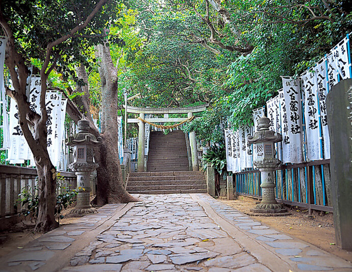 日本には数多くの島が点在しますが、愛知蒲郡の三河湾に浮かぶ竹島(たけしま)は特に神秘的。自生する植物も多く、自然がそのままの姿で残されており、島全体が天然記念物に指定されています。そんな竹島へ通じる道は一本だけ。竹島橋を渡って島に足を踏み入れます。橋を渡ってお出迎えする白い大鳥居、島の中央にあり開運・縁結びの神様として知られる竹島弁天を祀る八百富神社(やおとみじんじゃ)をはじめ、境内には他にも宇賀神社など4つの神社があり、島を歩いているだけで、島全体にパワーが充満しているようで、気が引き締まります。