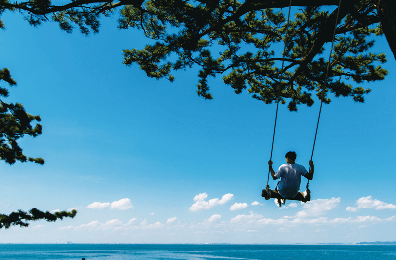 西港のサンセットビーチ・東港のサンライズビーチなど、名所の多い日間賀島ですが、中でもぜひ訪れてほしいのが、東港から徒歩約10分の場所にある、高台の木に吊るされた恋人ブランコ。広い空と大きな海を眺めながら、子供の気持ちにかえってブランコを漕げば、凝り固まった心もするりとほどけていくはず。