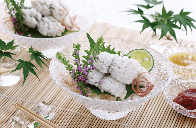 また、小暑のこの時期は祇園祭の真っただ中にありますが、祇園祭は別名を「鱧祭り」と呼びます。鱧は「梅雨の水を飲んでおいしくなる」といわれ、祭りの時期に旬を迎えます。祭りのご馳走として鱧料理がふるまわれたことが鱧祭りの由来とされています。鱧は生命力が強いことから、滋養がつく食べ物と考えられていました。ただ、細長い姿で小骨が多い鱧をさばくことは容易ではありません。そのため、京都では細かく骨を切るという「骨切り」と呼ばれる高度な技術が発達しました。湯引きされた鱧の姿は花を思わせる美しさです。伝統が息づく京都の食体験は、旅の経験値を押し上げてくれることでしょう。
