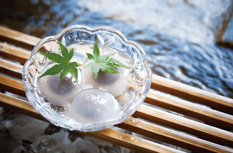 また、蒸し暑いこの時期には、岐阜県大垣市の銘菓「水まんじゅう」も外せません。自噴水がいたるところで湧き出す大垣は、舟運が盛んだった江戸時代には水都として栄え、今も豊かな水を生かした美しい街なみは「水の郷」と言われています。大垣で生まれた水まんじゅうは、葛粉とわらび粉を使った生地にこしあんを包み、お猪口で蒸して水温14度前後の地下水で冷やしたものです。こしあんが透けるような見た目も涼しく、つるんとしたのど越しもこの時期にぴったり。地下水に冷やされながら店頭に並ぶ様子も涼を誘います。