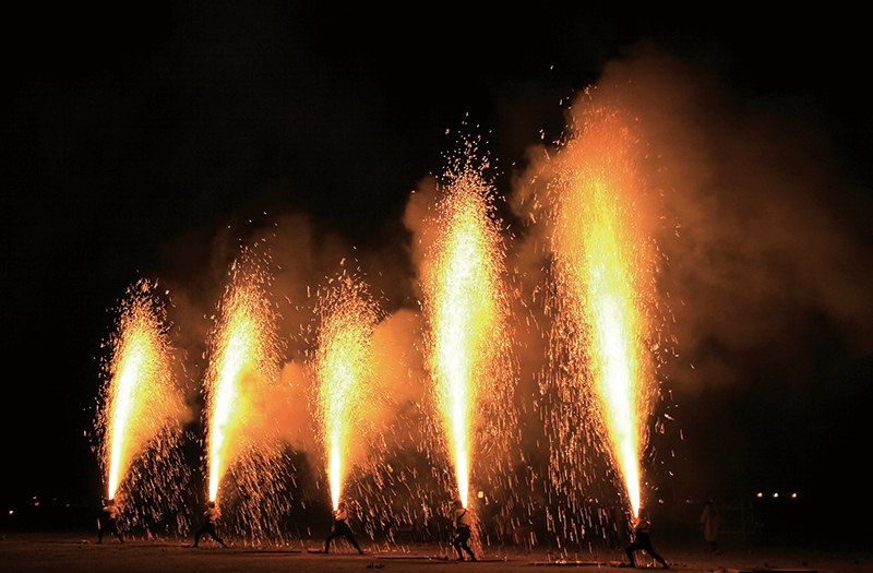 古来より伝わる神を祀る特有の祭事や神事が各地で行われますが、愛知県東三河では、例年この時期に手筒花火で有名な豊橋祗園祭が開催されます。吉田神社の例祭「祇園祭」は、江戸時代より花火祭としてその名を知られ、火によって悪霊放逐するという信仰から、毎年数百本の手筒花火が奉納されます。
