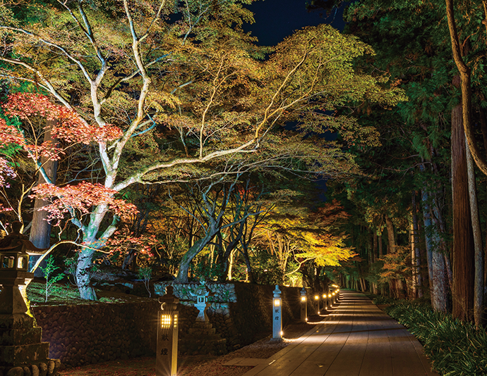 遠州三山はいずれも境内は自然豊かで、四季それぞれに異なる表情を見せてくれます。特に、秋は三山合わせて約3,500本のモミジが美しく、11月下旬以降になれば「紅葉ご利益めぐり」イベントやライトアップが行われ、紅葉をより深く楽しめます。