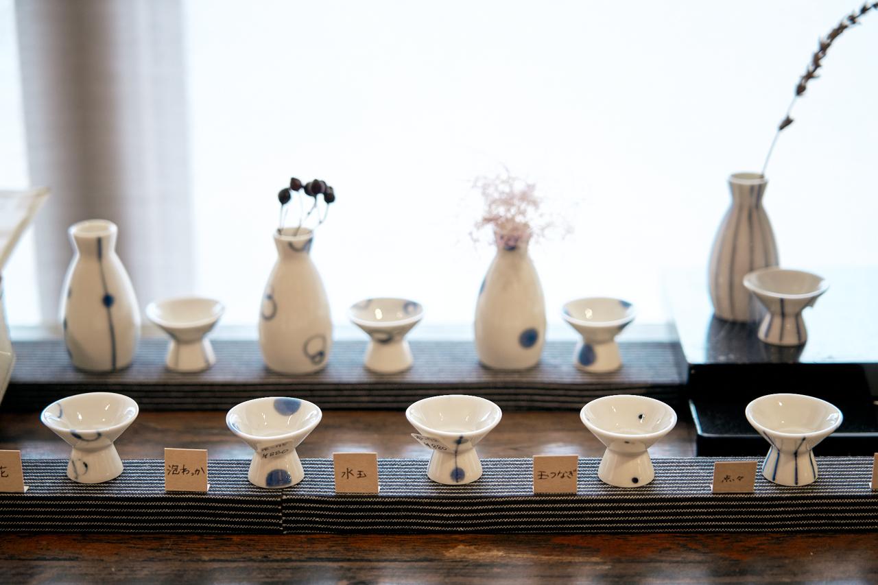 ここで、盃の形がもたらす味わいの違いを知ってみよう。〈カネコ小兵製陶所〉では口の広さや器の高さなどが違う4つのタイプを作っており、1本の日本酒を飲み比べてみると、その差がわかりやすい。香りを強く感じられるラッパ型、旨味を味わえるワングリ型、スッと喉の奥に届かせすっきりと飲めるストレート型、香りを閉じ込める形で濃厚さを堪能できるツボミ型、と、それぞれに合う日本酒も見つけられそう。