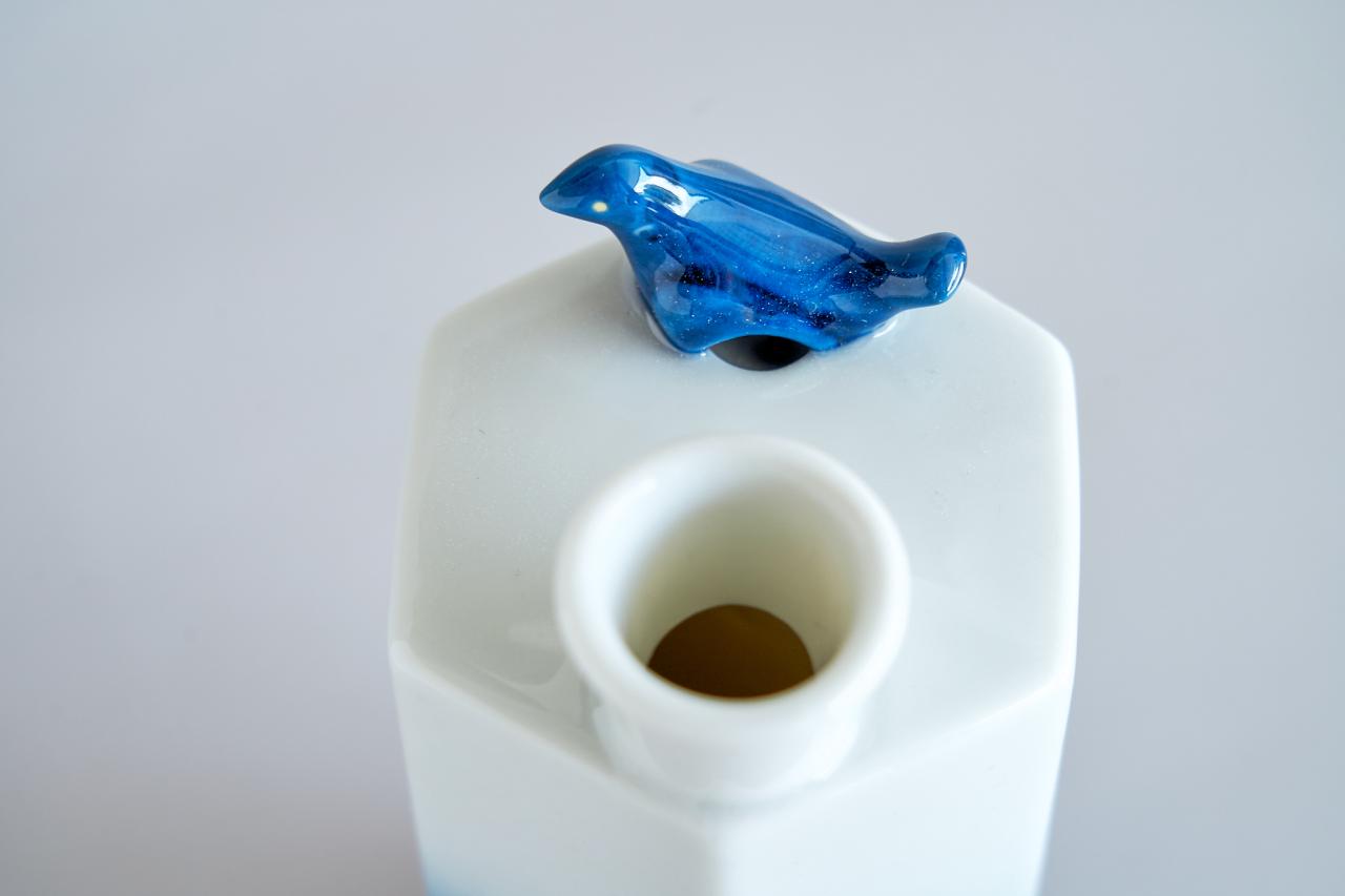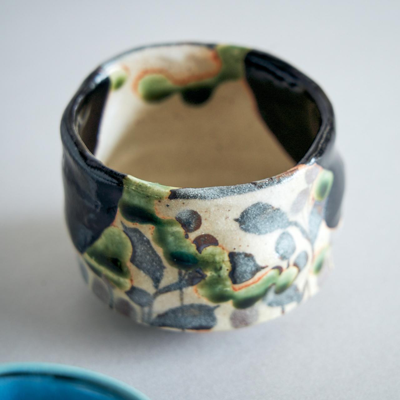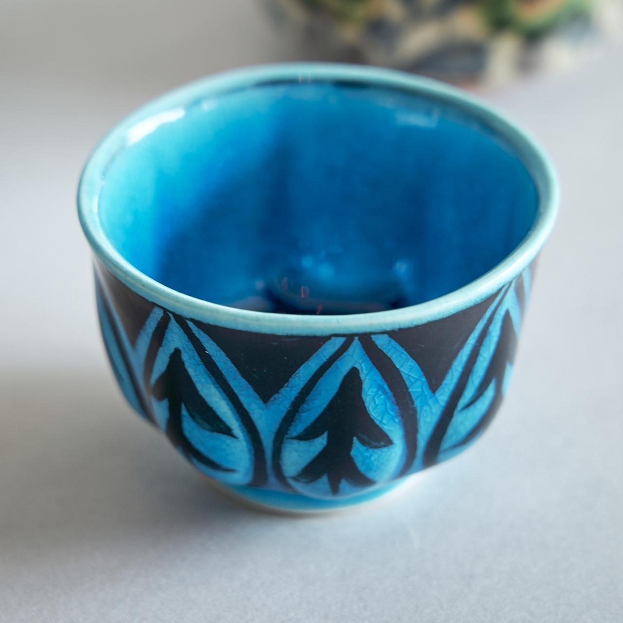 美術館からも近い場所にある〈幸兵衛窯〉は、青釉のシリーズが人気だという。ビビッドなカラーは、小さな盃なら取り入れやすい。ヨーロッパやアフリカのようなテイストも感じられるから、酒器としてだけでなくアミューズを盛る小鉢としても活用できそうだ。