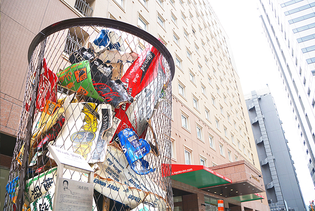 次は「東横INN品川港南口天王洲アイル」のアート作品をご紹介します。正面入口に置かれた巨大なゴミ箱のオブジェ『Work 2012』(三島喜美代作)は高さ約2.5メートルで見上げるほどの大きさ。鈴木春信の浮世絵を題材にした立体駐車場の壁画『“The Shamisen” Shinagawa 2019』(ARYZ作)も道行く人々の目を引きつけています。