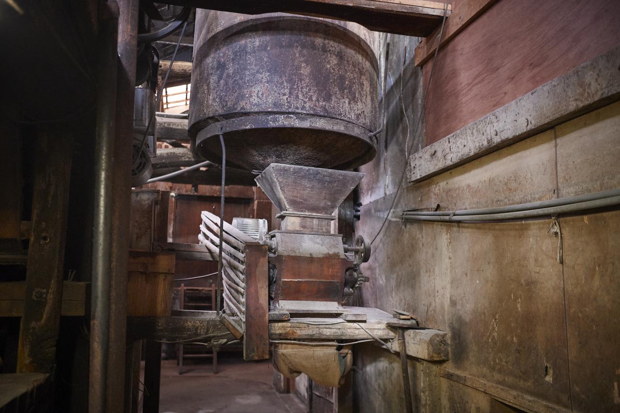 〈明治屋醤油〉では富山県産の大豆や、北海道産の小麦などを素材として使っている。近くには自社農園があり、材料の一部を栽培しているそう。素材にこだわった醤油は、体にいいものを食べさせたいと願うママ世代にも支持を得ている。まず見せていただいたのは、小麦を炒ったり、砕いたりする機械だ。昭和初期から使用している機械は現在も稼働中。熱々のままだと麹菌が失活してしまうため、炒った小麦は一度タンクで休ませてから、くだく作業に入るそう。
