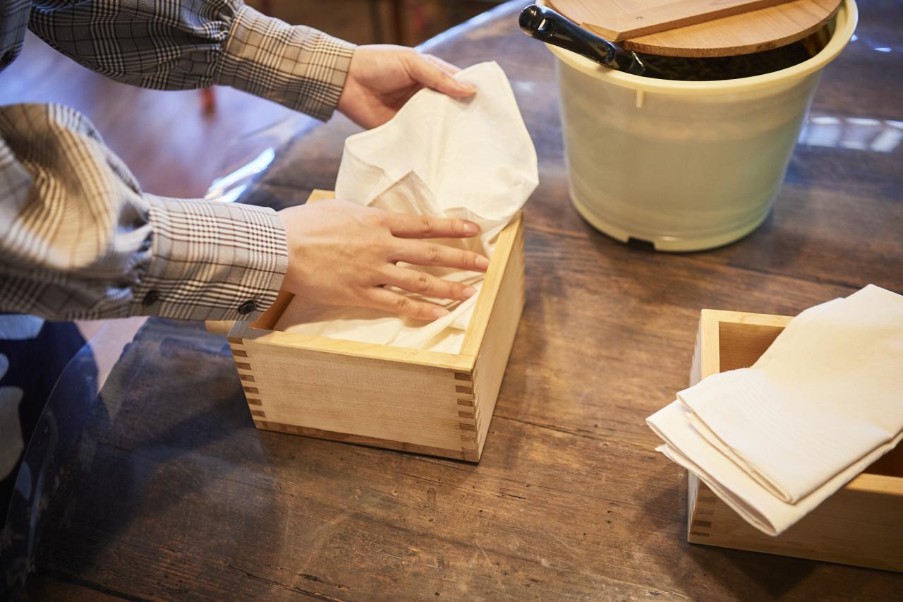 まずは升にふきんを1枚敷き、なかにもろみを入れていく。指定された量を入れ終わったら、ふきんの端を内側に入れて包む。この作業を3回繰り返していく。