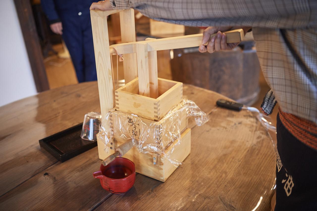 搾り器ごと傾けると、澄んだ色の美しい醤油が注ぎ口から流れてきた。120ml搾る必要があるので、何度か繰り返し作業を行う。