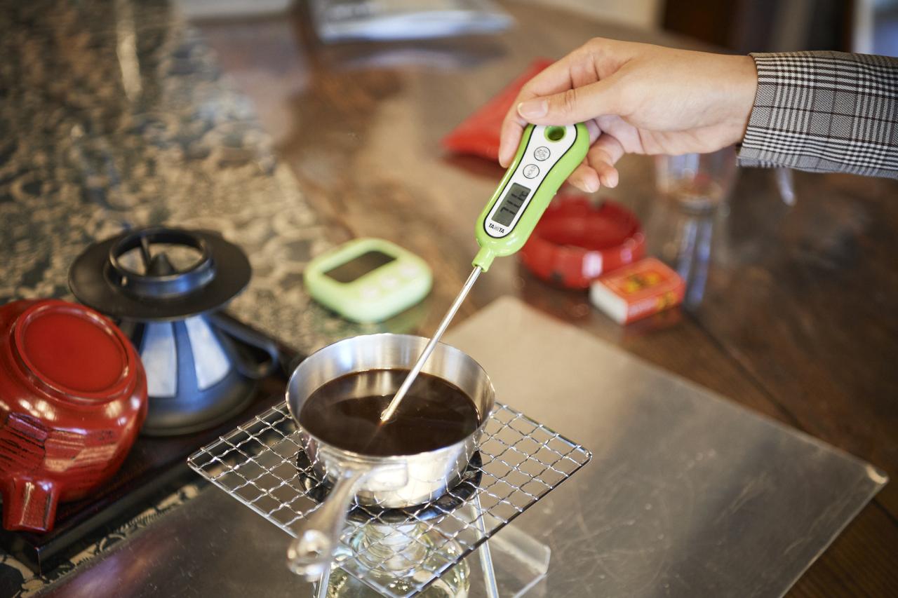 小さな鍋で、80度まで熱する。立ち込める醤油のいい香りがたまらない。火入れすると日持ちしやすくなるので、旅行中でも安心だ。最後にフィルターで漉して、火入れは完了。小さな瓶に醤油を詰め、蓋を締める。「じぶんしぼり醤油」のパッケージを貼ったら、自分だけの醤油が完成! 野末さん曰く、刺身や煮物などどんな料理にでも使いやすい万能醤油だそうだ。開封したら冷蔵庫で保存すると、香りが飛びにくいのでおすすめ。