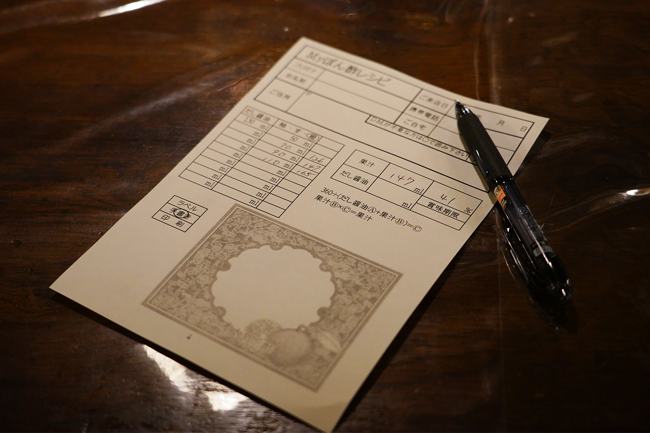 配合を記録したレシピはお店に保存されるため、使い切ったあとも電話一本でMyぽん酢を再注文できる。その際に「もう一段階、果汁を増やしてほしい」といったオーダーも可能だ。なかには、Myぽん酢をたくさん注文して友人にプレゼントされる方もいるとか。
