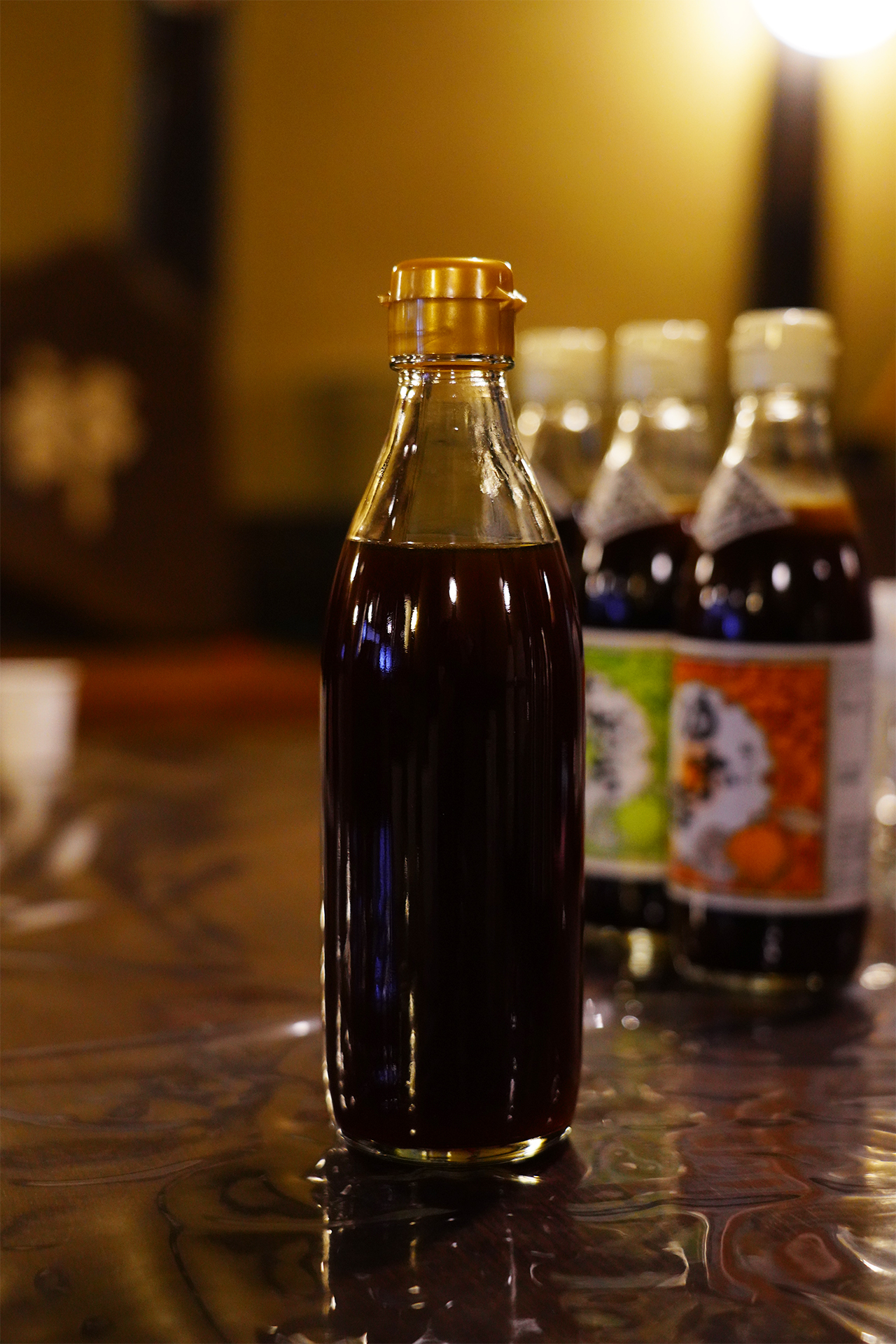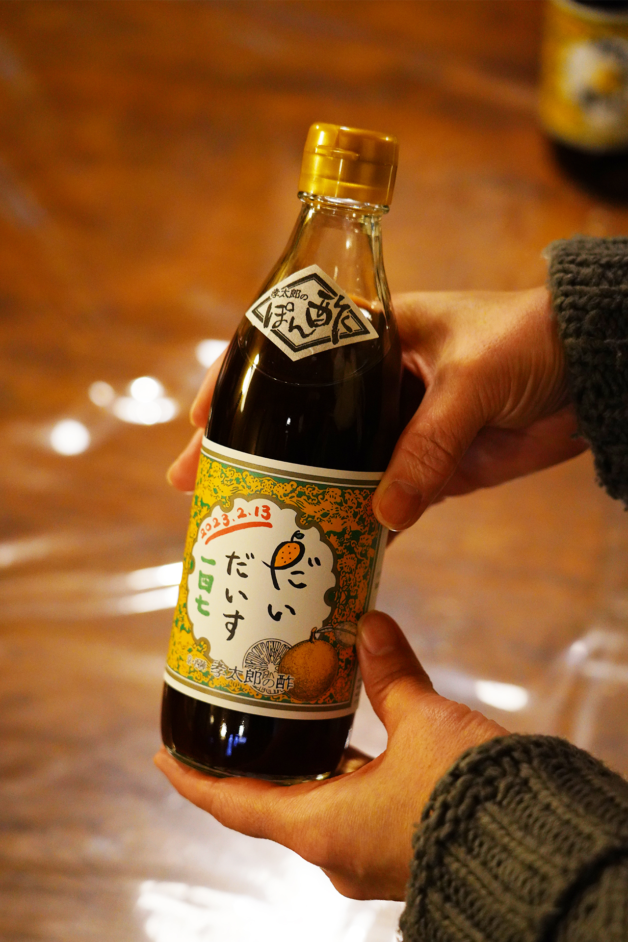 まず、Myぽん酢づくりの重要なポイントとなるのが生果汁選びだ。お店で販売されている「ゆず酢」「すだち酢」「だいだい酢」を少しずつ参考に味わい、どれが好みか選ぶ。「柚子は一番香りが良く、甘みもあります。すだちはスッキリとした酸味が際立ち、脂ののった素材に合います。橙は馴染みが薄いかもしれませんが、お正月に飾る鏡餅の上に乗っている果物といえばピンとくるでしょうか。穏やかな酸味は素材の味を引き立てるため、白身魚が好きな方にはおすすめです。」と佐藤さん。