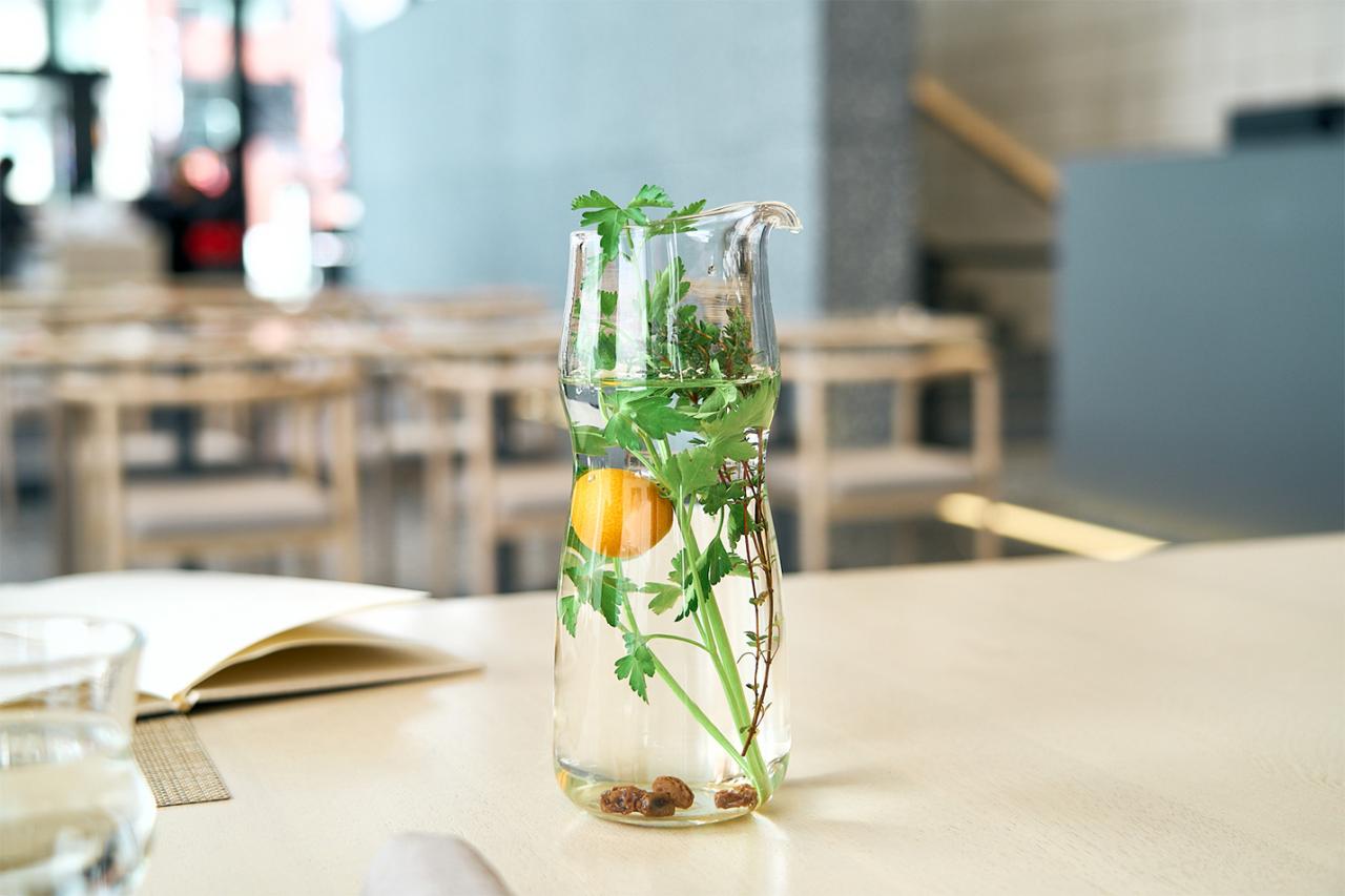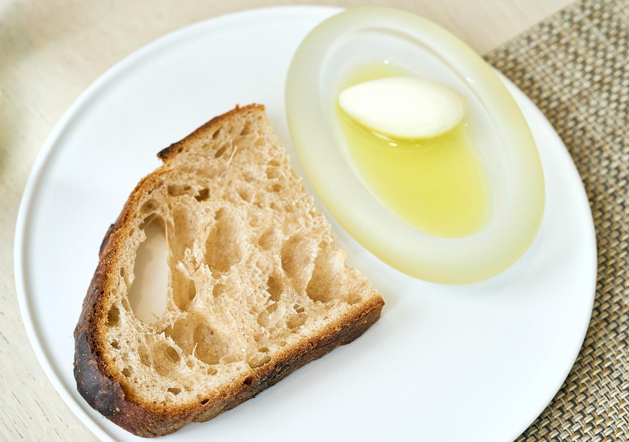 セットのパンは、バゲッティーヌ、サワードゥ、くるみの中から選べる。エクストラバージンオリーブオイルとともに添えられているのは、ジャージーミルクの塩ホイップだ。カッテージチーズのような淡白な味わいで、さっぱりといただける。食事の間に楽しむ飲み物は、各テーブルにサーブされるハーブウォーター。フルーツやハーブなど、季節に合わせて選んだ食材を漬けたもので、美容や健康にも効果があると注目されている。この日は、金柑やイタリアンパセリなどが使われていた。ビジュアルも爽やかで、家に帰ったら真似したくなる。