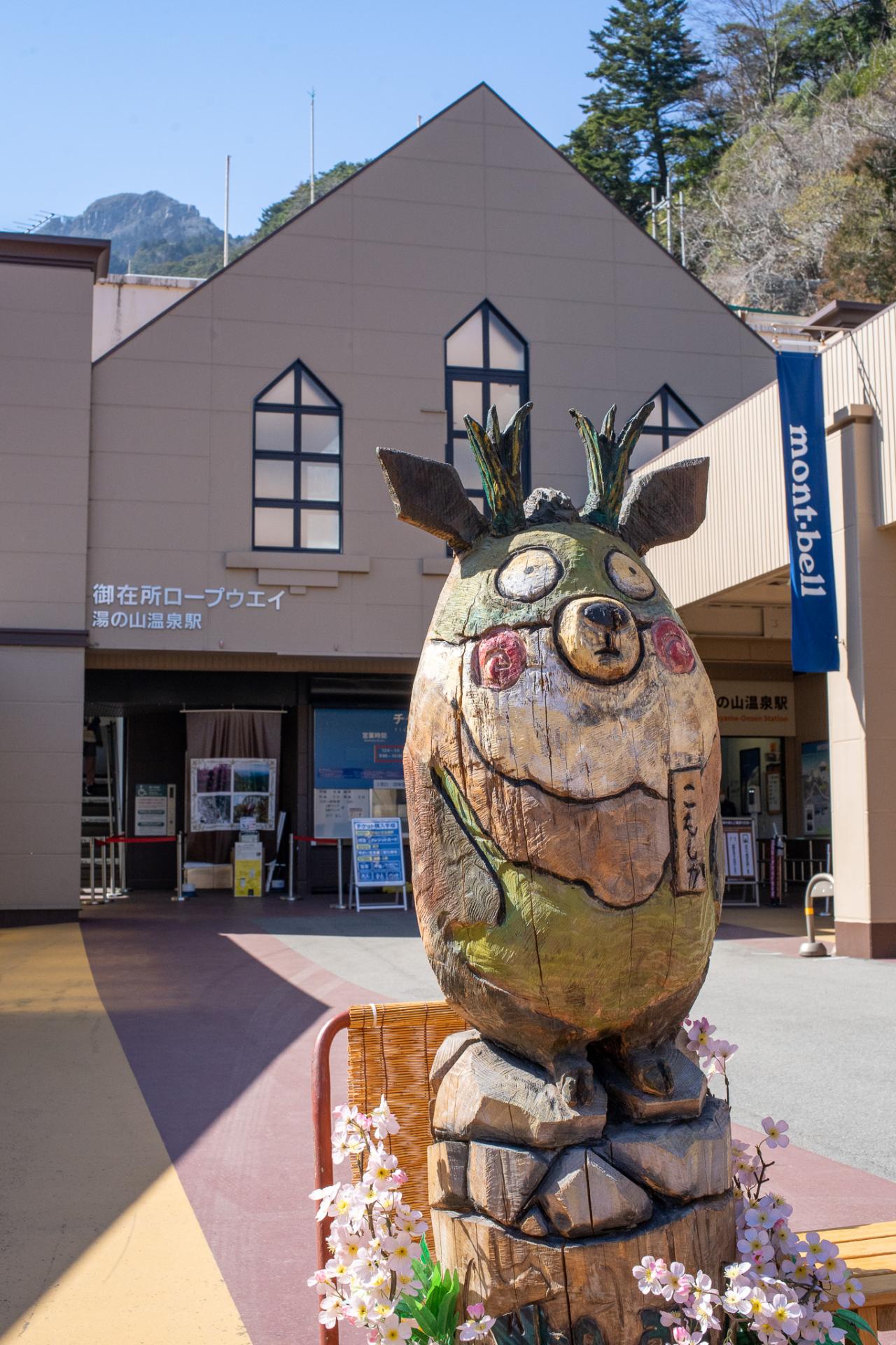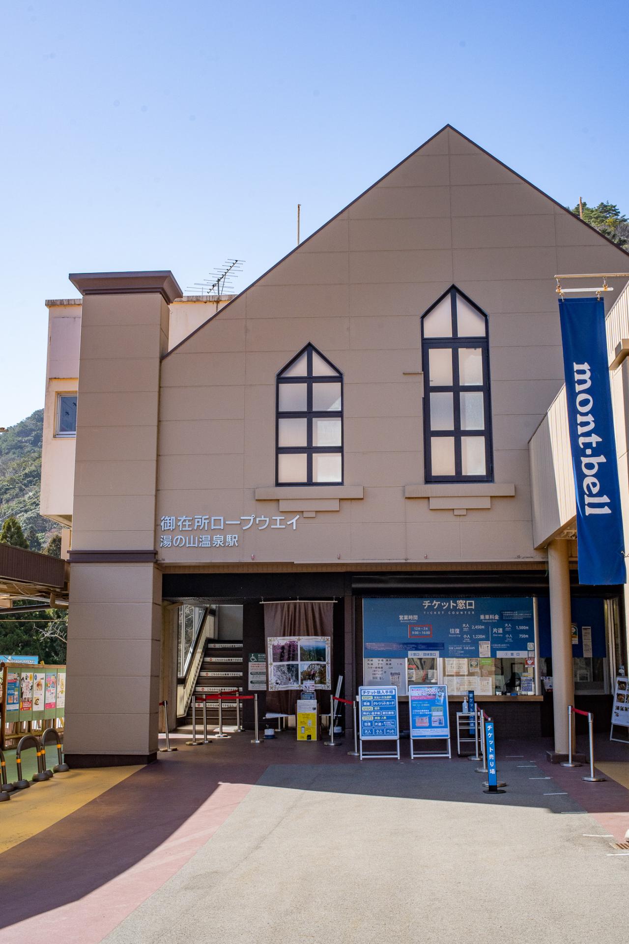 レンタカーで近鉄湯の山線の終着駅「湯の山温泉」を横目にしばらく進むと、曲がりくねった山道の先に御在所ロープウエイ駅が見えてきます。ロープウェイ乗り場の駐車場に車を停め、早速乗車券を購入しにいきます。