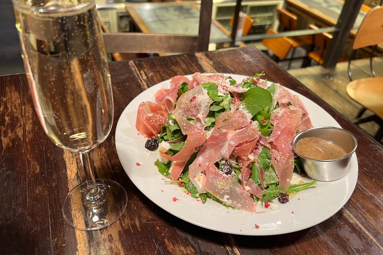 サラダは「ルッコラとルッコラセルバチコのサラダ 生ハムと山羊のチーズ」をチョイス。ルッコラはカリウム、ビタミンC・Eなど美容に良い栄養素がたっぷり。これはもりもり食べたくなりますよね…!山羊乳を使用した四角いフェタチーズ、羊乳を使った粉状のペコリーノロマーノもかかっていて、これで牛・山羊・羊それぞれのチーズの食べ比べをすることが可能に…!そのままでも充分美味しいのですが、ヴィネガーとマスタードを中心としたドレッシングも添えられているので、味変でかけてみるのもおすすめです。せっかくなので、このお店ならではのメニューも。気になるメニューは多々ありますが、今日はラム肉女子会を極めようと「仔羊のたたき」をチョイスしてみました。赤身本来の甘みとうま味が噛めば噛むほど口に広がります。臭みがなくあっさりとしているので、フォークが止まらずペロッといただいてしまいました。