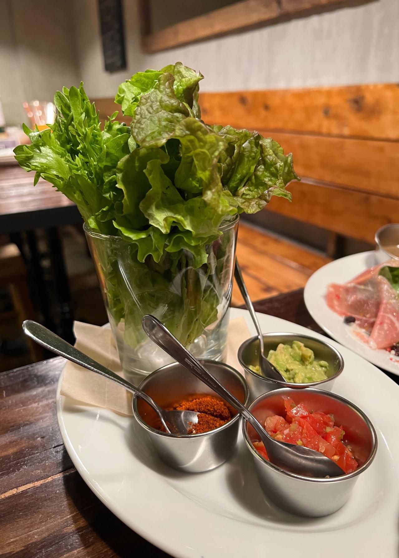 ラム肉を最大限に味わえるよう、付け合わせも充実。グリーンペッパーマスタードはピリッと感じる辛さが癖になります。じっくり焼かれた野菜たちは素材そのものの良さを存分に引き出すために、大きめのカットで味付けも最小限。ほっとした甘みを感じます。サルサ・アボカド・シーニングスパイス(洋風七味)とサンチュのロールセットもぜひ一緒に注文を。巻いて一緒に食べれば、フレッシュな野菜がラム肉の美味しさを新たに引き出してくれます!ラム肉の魅力に感動しながら、会話も弾み、身も心も大充実した女子会の夜は更けていきます。え?どんなことを話したかって?それは煙と一緒にダクトから神保町の夜に抜けていった…ということで。