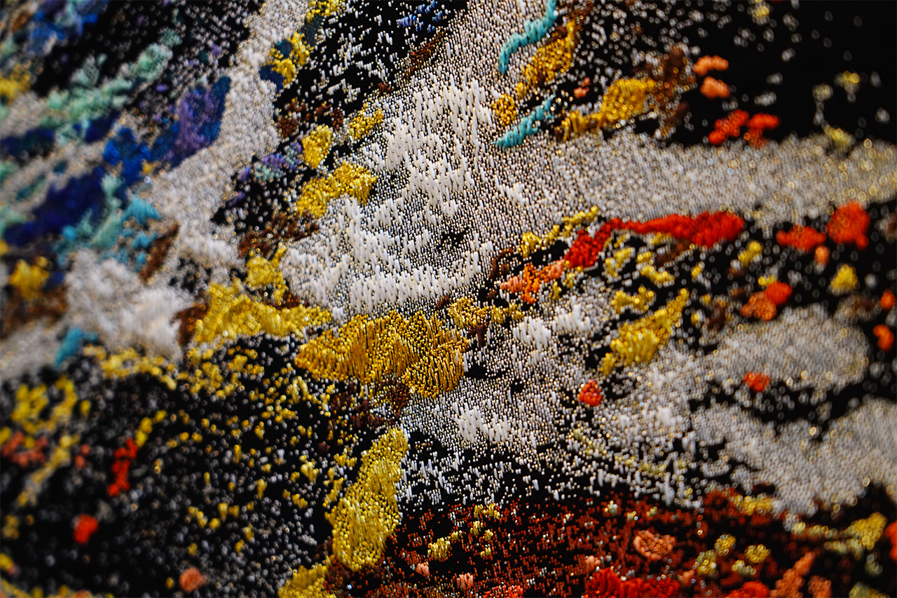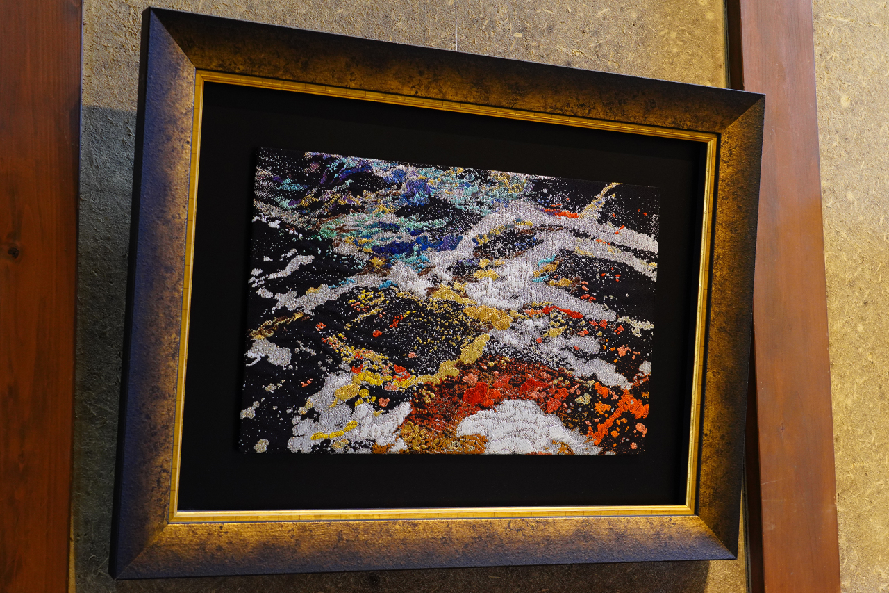 錦織の素晴らしさは他にもある。「錦織は“光の織物”とも呼ばれます」そう言って、周さんが携帯電話のライトを作品にかざすと、光を反射するように煌めいた。絹糸には光を透過、反射する性質があり、光の角度によってさまざまに表情を変えるのだという。