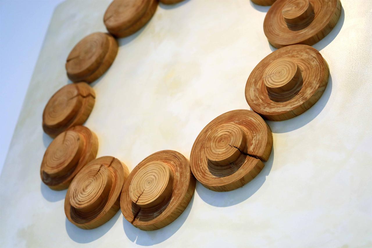 土壁の建造物としては現在、国内最大級。継ぎ目のない美しい仕上がりは、伊勢神宮をはじめとする神社仏閣の左官職人集団〈工房カズ〉によるものなのだそう。“雨が壁に染み込んで少しずつ朽ちていく様子もひとつのアート”という考えから、雨どいもつけていない。自然の力と時の流れとともに経年変化を遂げ、徐々に土地になじみながら、風景の一部になっていくことを想定している。