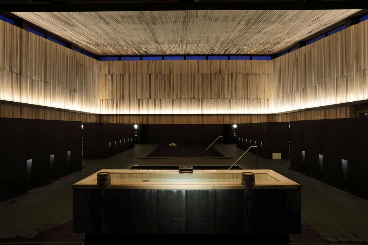入口すぐの湯あがり処「七十二候の間」は72本の竹であしらわれた贅沢な空間。かつて山野を歩き回って薬草を探していた、本草学者の休息をイメージしたという。