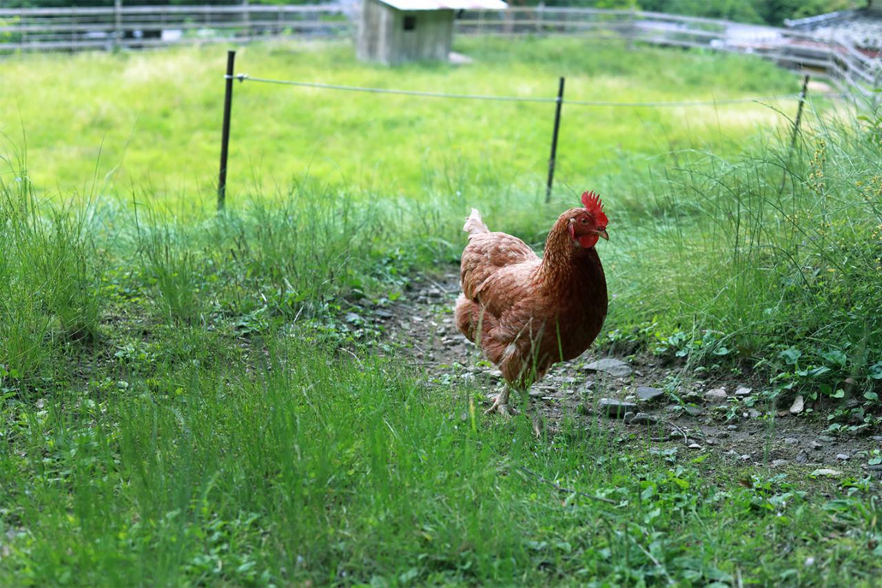 鶏たちは庭だけじゃなく店内でも自由に過ごす。ストレスがないのだろう、福々と丸くトサカの色も羽ツヤもよい。「4時半になると自分で小屋に帰るんですよ。カエル食べたりおたまじゃくし食べたり、元気ですね。残飯も雑草も食べてくれるし」