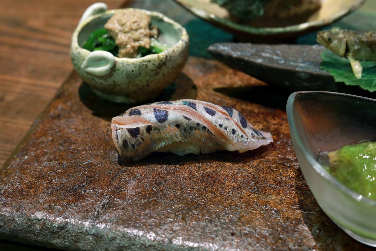 料理のメニューは「季節のおまかせ(9~10皿)」¥7,700(税込)のコース1種類のみ(内容は仕入れ状況や時期により異なる)。前菜は、鳥羽産サザエと美杉の山の幸の合わせ盛り・稚鮎の白扇揚げ・米ナスのオランダ煮・アマゴの握り・ほうれん草と水菜の胡麻よごしの5品。
