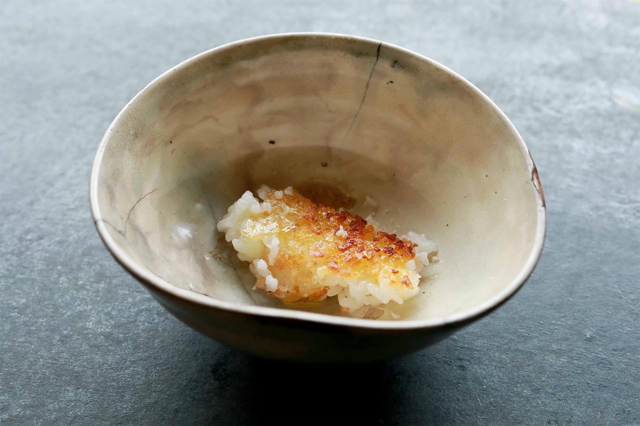 締めのお食事は、自家栽培の白米と赤だし、糠漬け。ご飯はまずはそのままでいただき、2杯目はお焦げ。さらに3杯目は鹿肉丼か、菜種油と塩をかけたもの、お醤油をひと垂らしして炙った香ばしいご飯から選べる。きれいな水と空気の中で自然農法で育ったお米を竃(かまど)炊き。美味しくないはずがない。