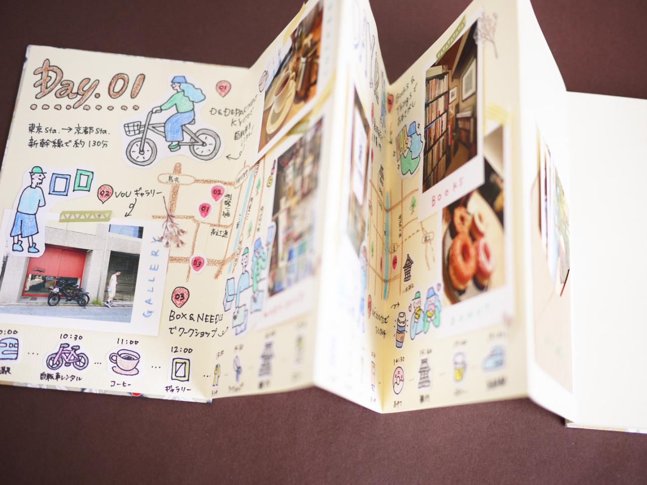 中面は、まずベースとなる地図などを手書きで描いてから、装飾するように写真や訪れたお店のチケットなどを配置するのがおすすめです。手書きのイラストも別の用紙に描いたものを切って貼り付けると、レイヤー感も出て、レイアウトの検討もしやすいかもしれません。紙面に動きが出るように、あえて重ねて貼り付けるのもおすすめ。
