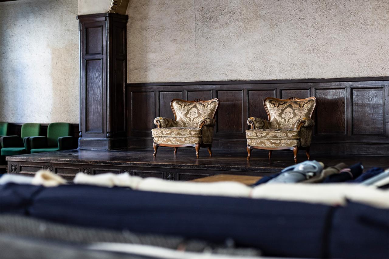 3階にある立派な大ホール(旧会議場)も、同じく生地のストックヤードとして活用されている。ここは館内でも特に往時の面影が色濃く残る空間だ。歴代組合長の肖像画、調度品や舞台に施された繊細な意匠…。どこも見応えがあり、つい時が経つのを忘れてしまう。