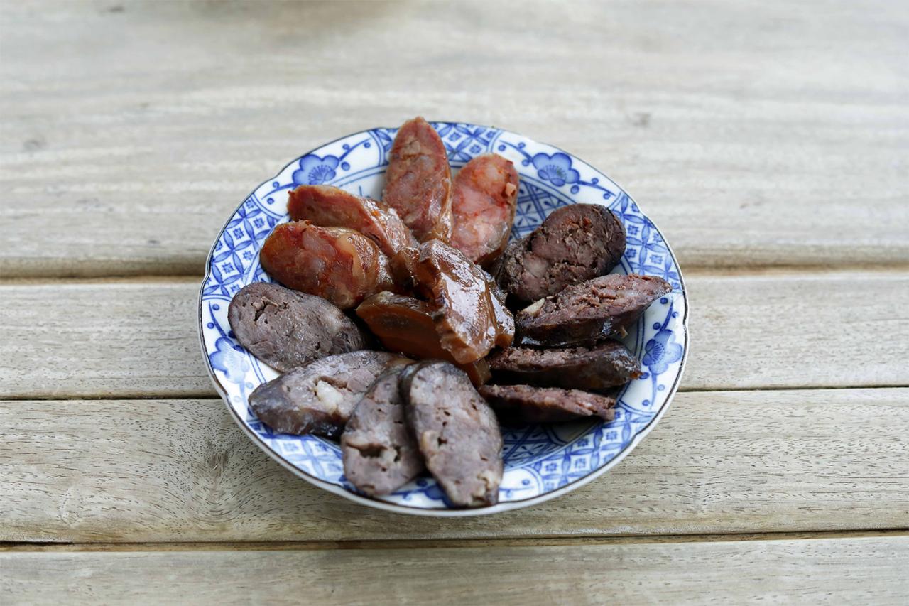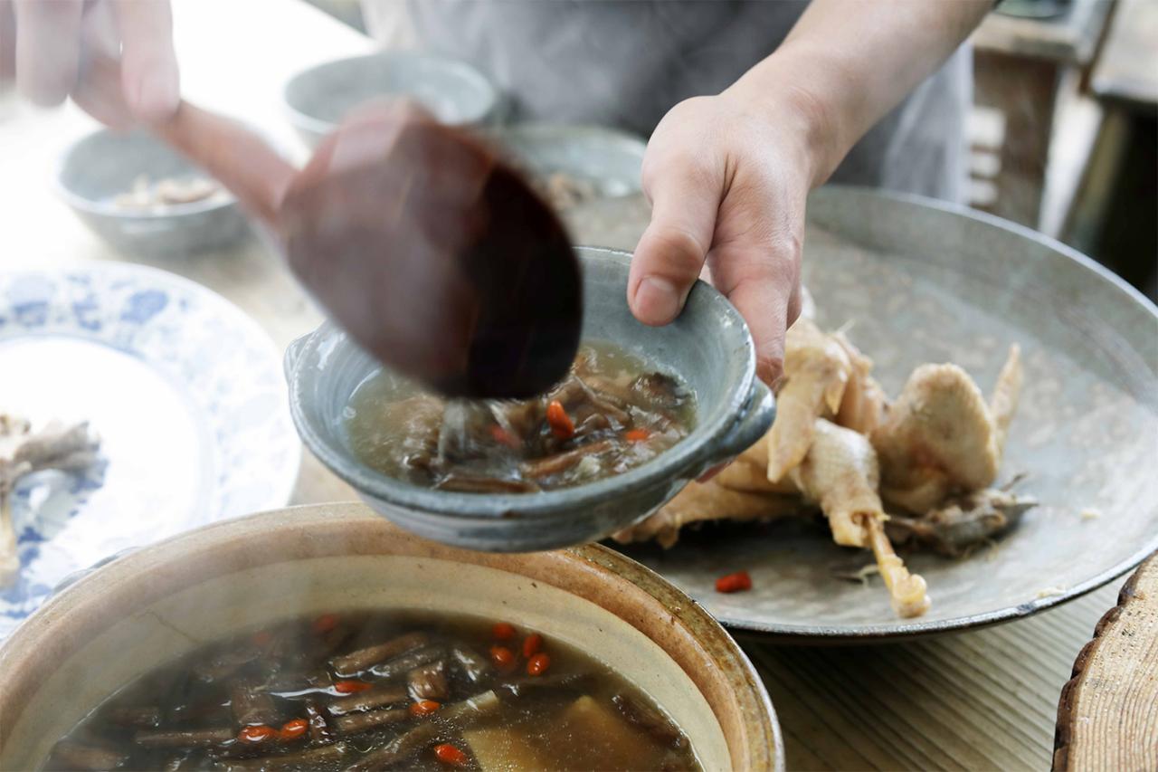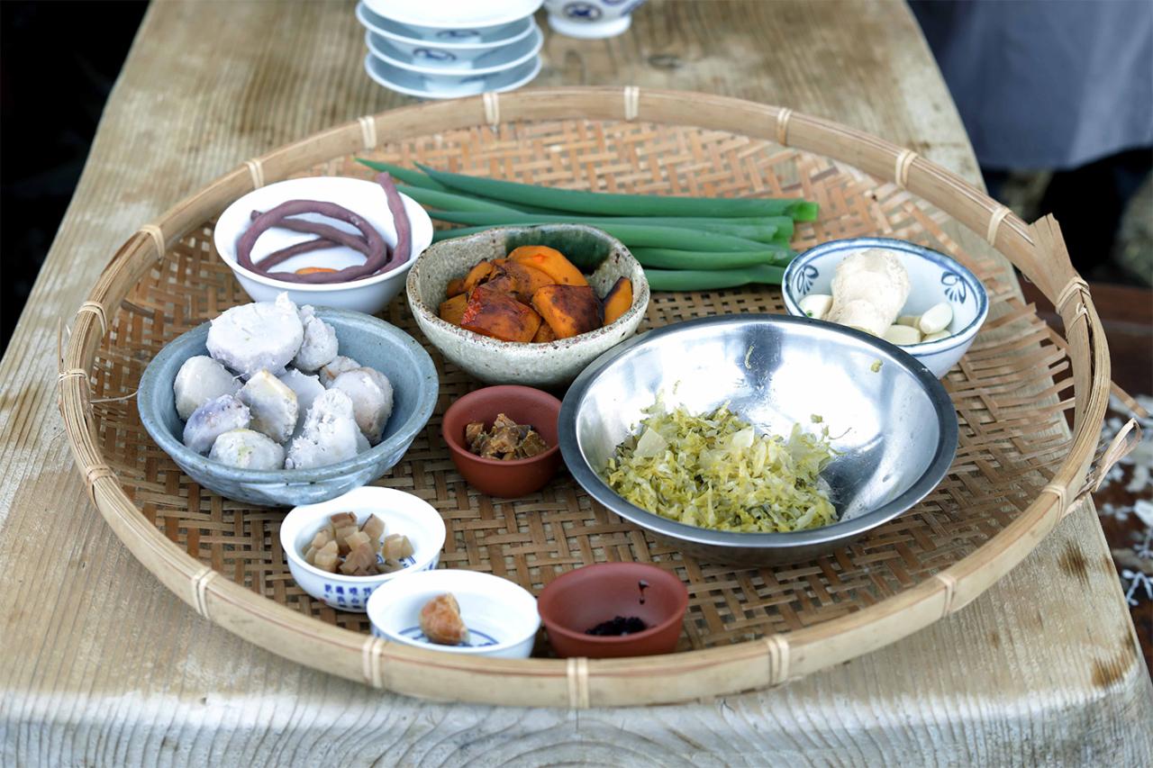 畑で刈った野菜とともに、屋外にセットされた食卓へ。飲み物はこの辺りで採れた野草の温かいお茶と、紹興酒をいただくことにする。