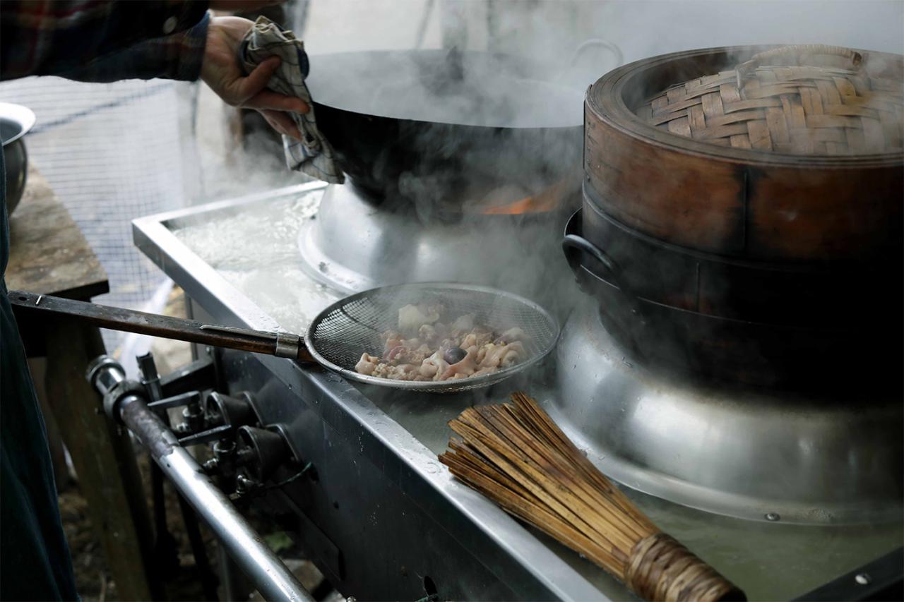 ニコニコ出迎えてくれたのは渡辺幸樹さん。京都市二条にある中華料理店〈大鵬〉の二代目で、ここ〈田舎の大鵬(いなかのたいほう)〉の主人である。ここは、その日の料理に使う鶏を絞めるところからコースが始まるという、滅多にお目にかかれないスタイルのレストラン。養鶏場をベースにした農場内にある屋外スペースで、幸樹さんによる中国コース料理をいただけるのだ。