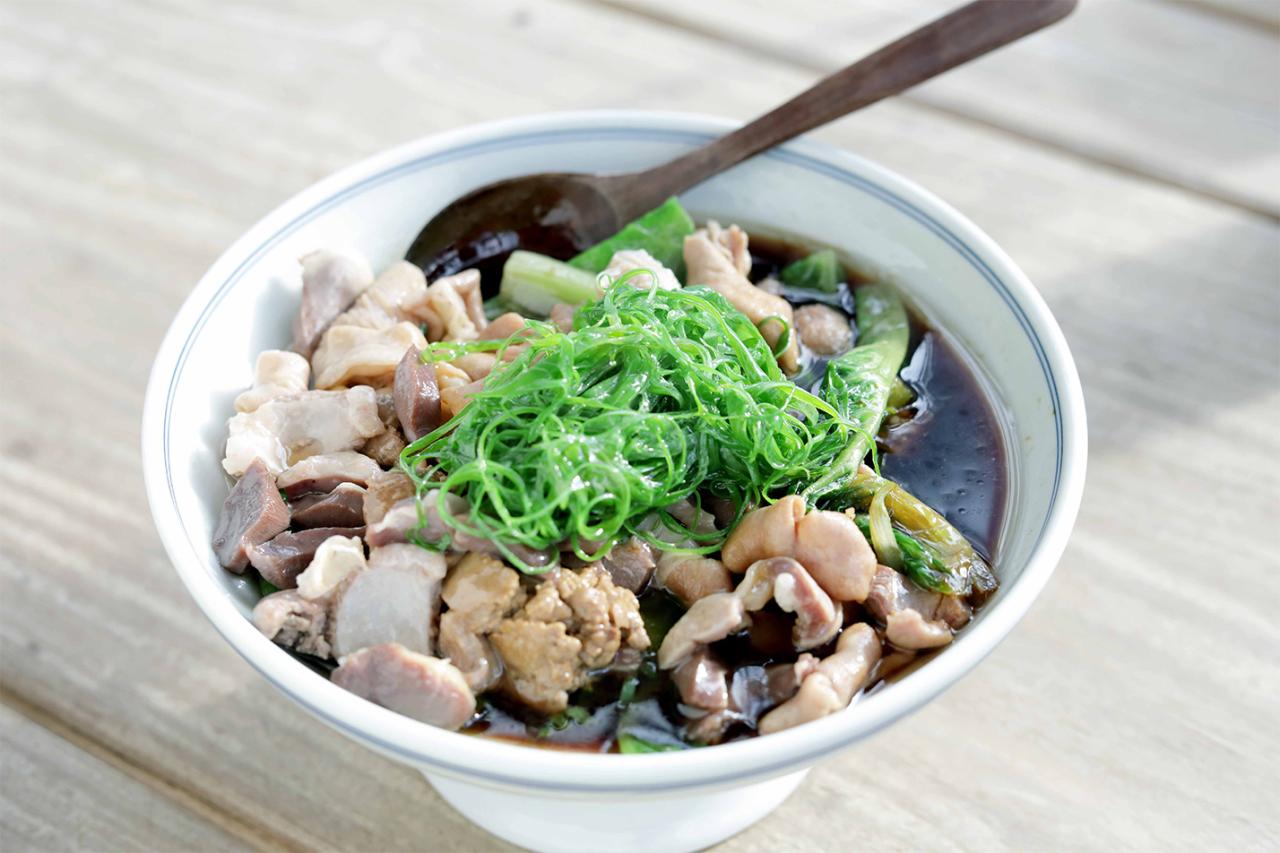 先ほど絞めてもらった鶏が登場。湯引きした内臓に極細切りのネギをのせ、カンカンに熱した鶏油(ちーゆ)をジャッと。捌きたての鶏でしか叶えられない一品。「僕も初めて食べたとき、開きたての内臓ってこんな味すんねや!ってびっくりしました。瞬間の、“命の味”ですね」。鶏油の旨味がどっと溶け込んだ醤油だれも絶品。