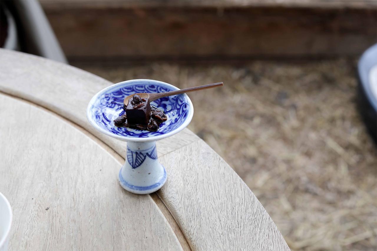 デザートは温かい黒胡麻餡入りのお団子。綾部産の無農薬のもち米を使っている。ほんの少しのお砂糖と、天日干しした赤米の玄米、松の実、そして胃を温めてくれる陳皮。「温かい料理を召し上がっていただいたあとなので、胃がびっくりしないように」。