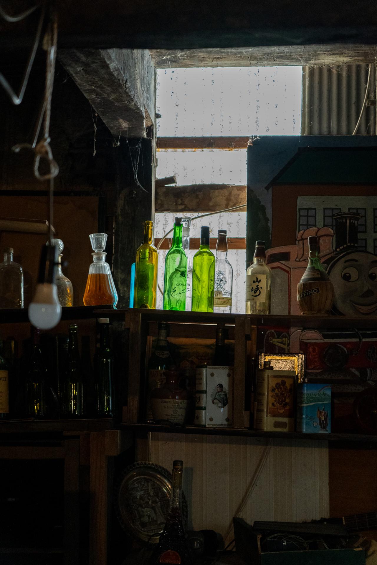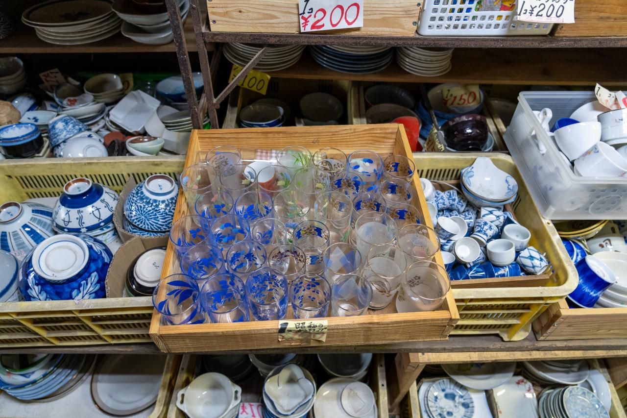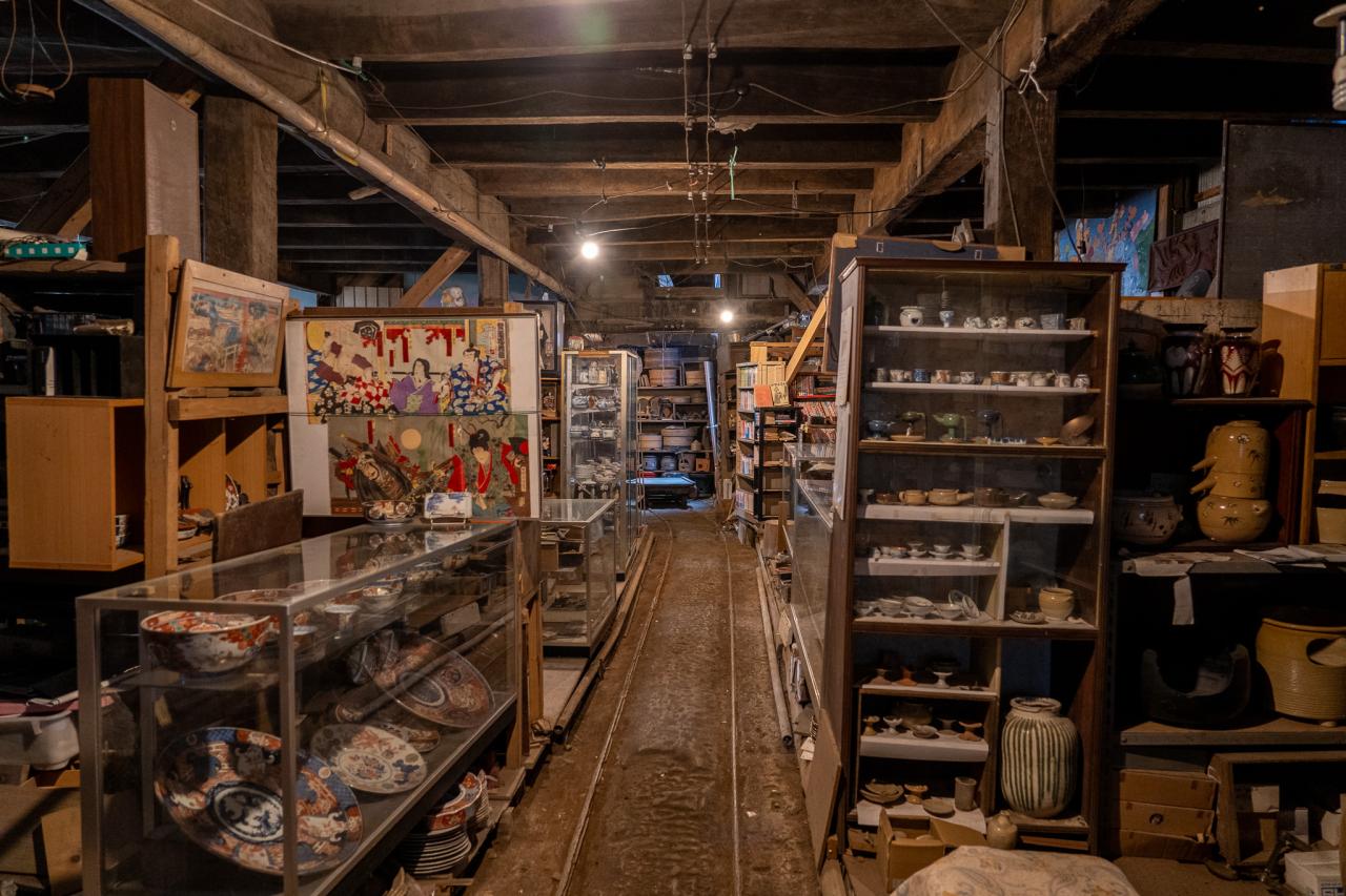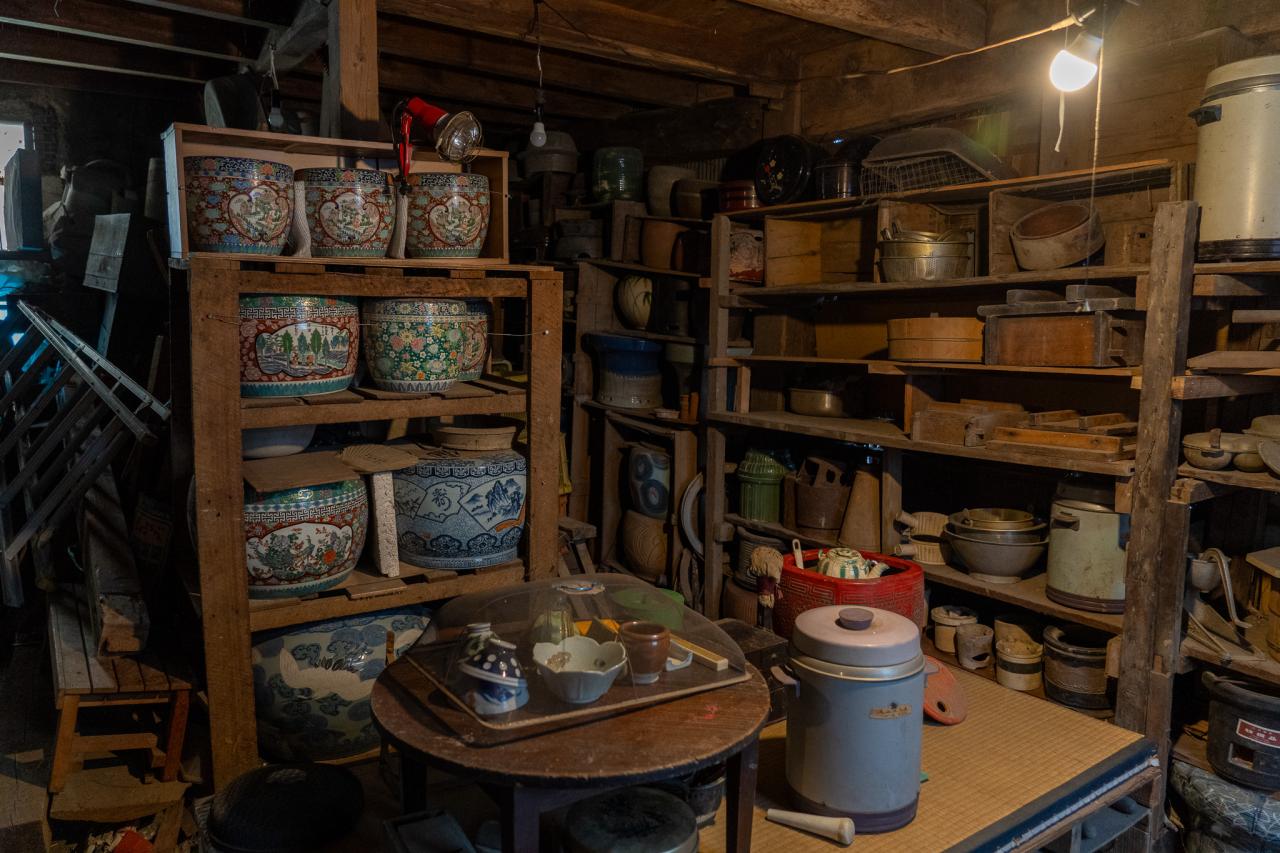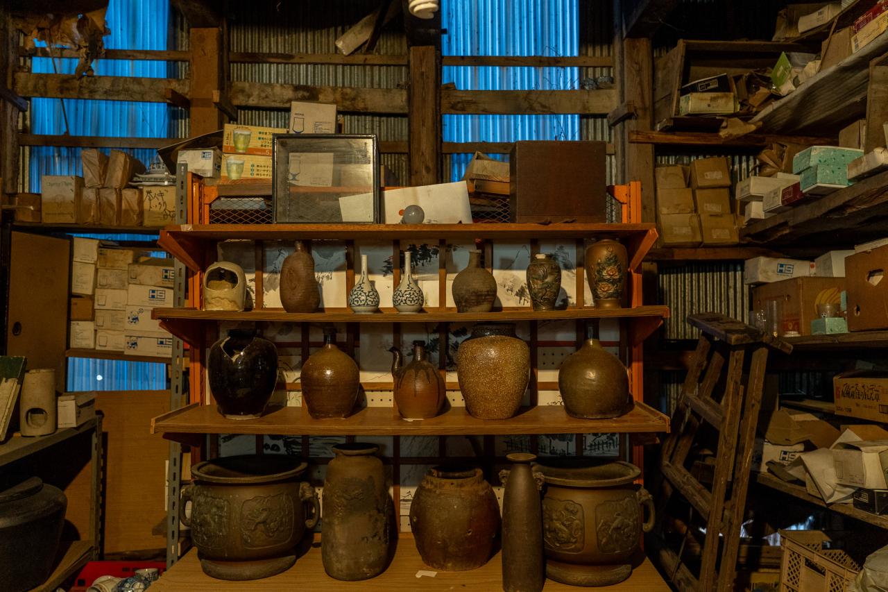 細い通路を埋め尽くすように陶器や古道具が陳列されております。