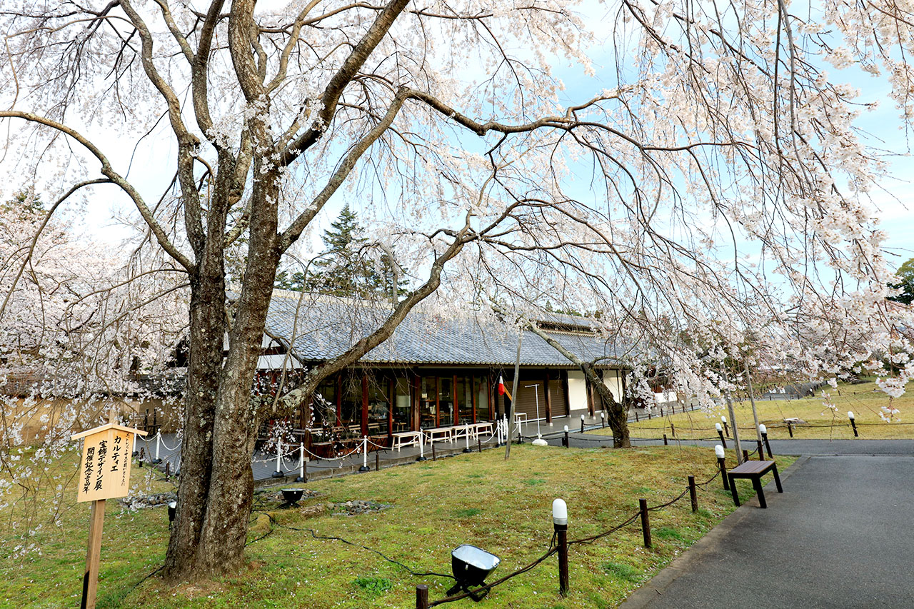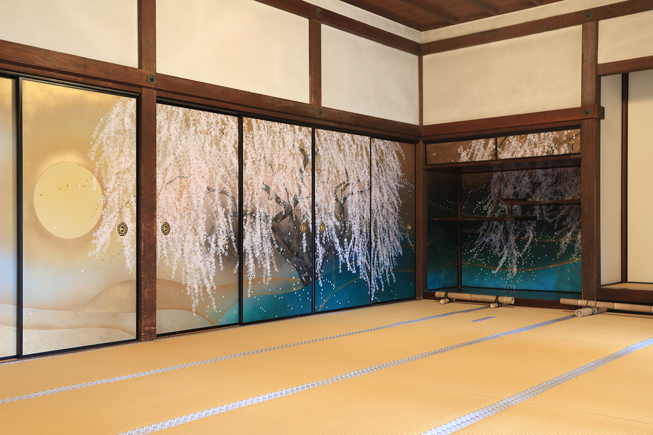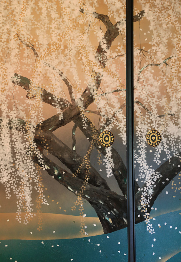 桜の華やかさとはまた違う、荘厳な美しさを感じられる。時間を忘れて眺めていたくなる庭だ。もうひとつ心を動かされたのが室内に咲く桜。平成に浜田泰介画伯によって描かれた襖絵で、月の光を受けて花びらが舞う姿に風情を感じる。桜を堪能したあとだからこそ、繊細な筆致にいっそう感じ入るものがあるのかもしれない。