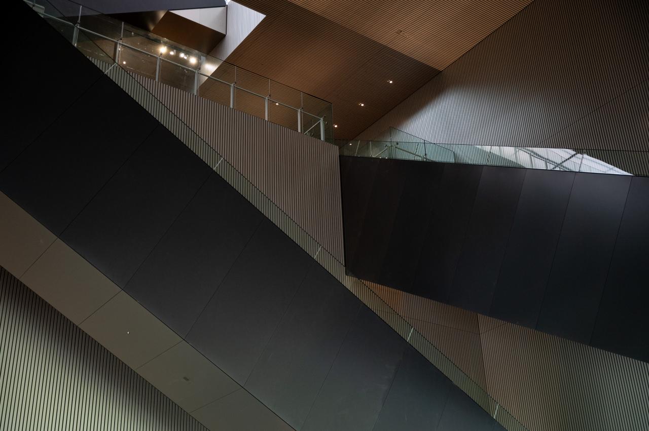 ホテルから徒歩7分くらい歩くと、黒い大きな建物があります。2022年にオープンした新しい「大阪中之島美術館」です。近現代美術とデザイン作品を中心に展示しており、そのときどきによってさまざまな展覧会が開催されています。美術館の建物もとても目を惹く建築で、中に入ると開放的な広い空間にクロスするエスカレーターも、スタイリッシュでおしゃれです。