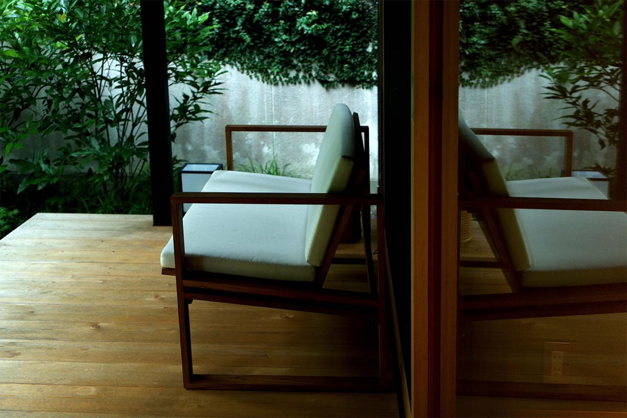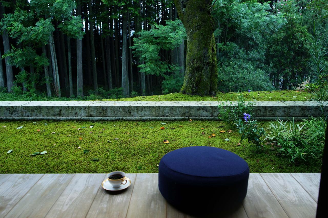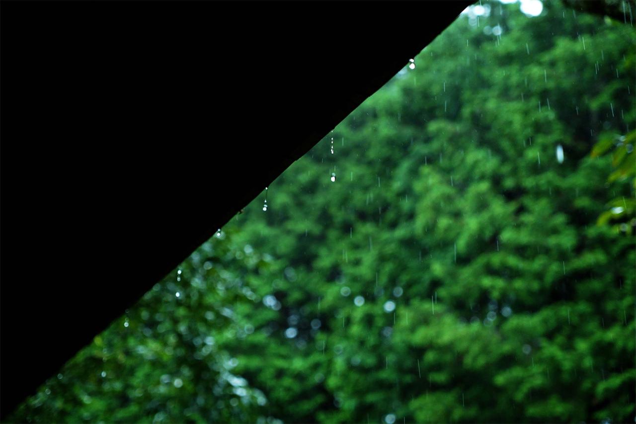 目の前に大きく広がる檜林の下には、サラサラと流れる梅谷川。「この場所って建築条件がかなり厳しくて、川沿いまで大きな建物を作ることができないんです。堀部さんには、音は聞こえるけど見えないくらいの距離感がいいのではないかと言われたんですが、その通りでしたね」。この日は、途中から雨。「そうそう雨もね、すごくいいんです。苔や緑がきれいでしょ。雨水が瓦を伝って雨落ちの石に落ちてくるのもいい。東京で雨が降ると、ああー、タクシー捕まるかな……ってなるのに(笑)」。昔ながらの手刻みで建てられた木造建築。施工は〈羽根建築工房〉、造園は〈いば庭園〉の伊庭知仁氏が手掛ける。