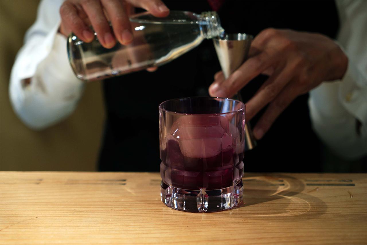 最後の1杯は、ラベンダーと郡上八幡産の衣笠茸のスピリッツ・傾城(けいせい)を使った「太夫の恋」1,700円。傾城とは城が傾くほどの美女から転じて最高位の遊女(太夫)のこと。安らぎと色気を併せ持つ独特の風味で、まさに“飲む香水”そのもの。