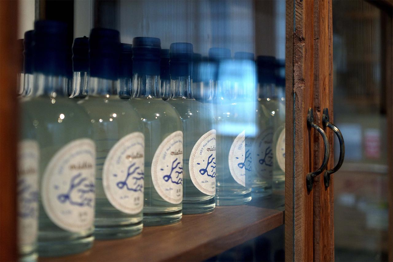 昼間の営業は、ノンアルコールスピリッツ「miatina」の試飲とボトル販売タイム。3種をじっくり飲み比べできる。自分へのお土産にはもちろんのこと、ギフトにしたら確実に喜ばれそう。左から然仙、非時、傾城 500ml 各4,180円。