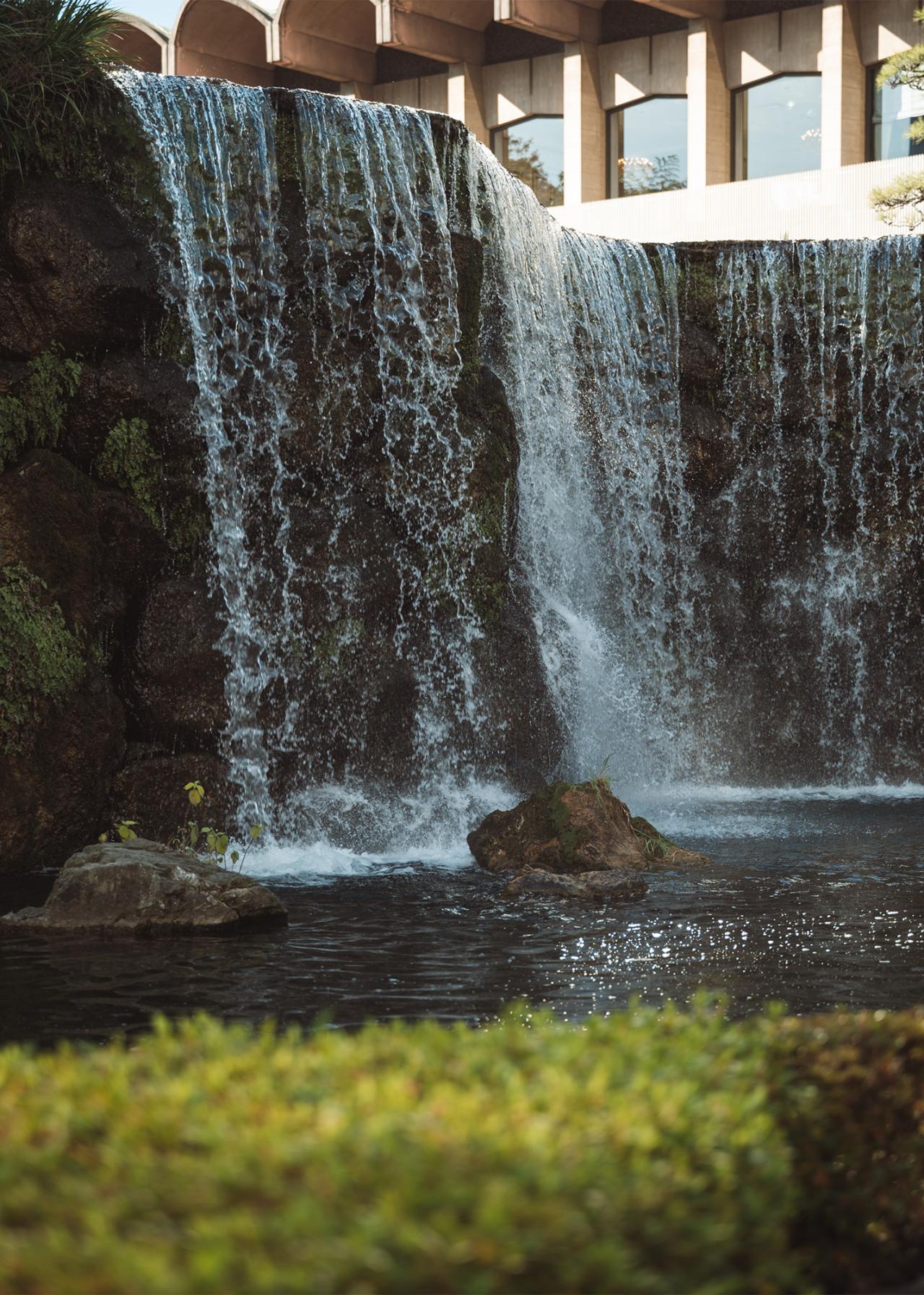 ホテル敷地内に広がる日本庭園は、訪れるたびにその美しさに感動させられます。かつての江戸城外堀に囲まれた約1万坪の敷地、400年余りの歴史がありずっと大切に手入れされてきたこの庭園には、滝のせせらぎ、池を泳ぐ鯉など、どこを歩いても風情を感じます。この日は夕方に散策したため、柔らかな光が庭園を包み込み、一層幻想的な雰囲気を醸し出していました。