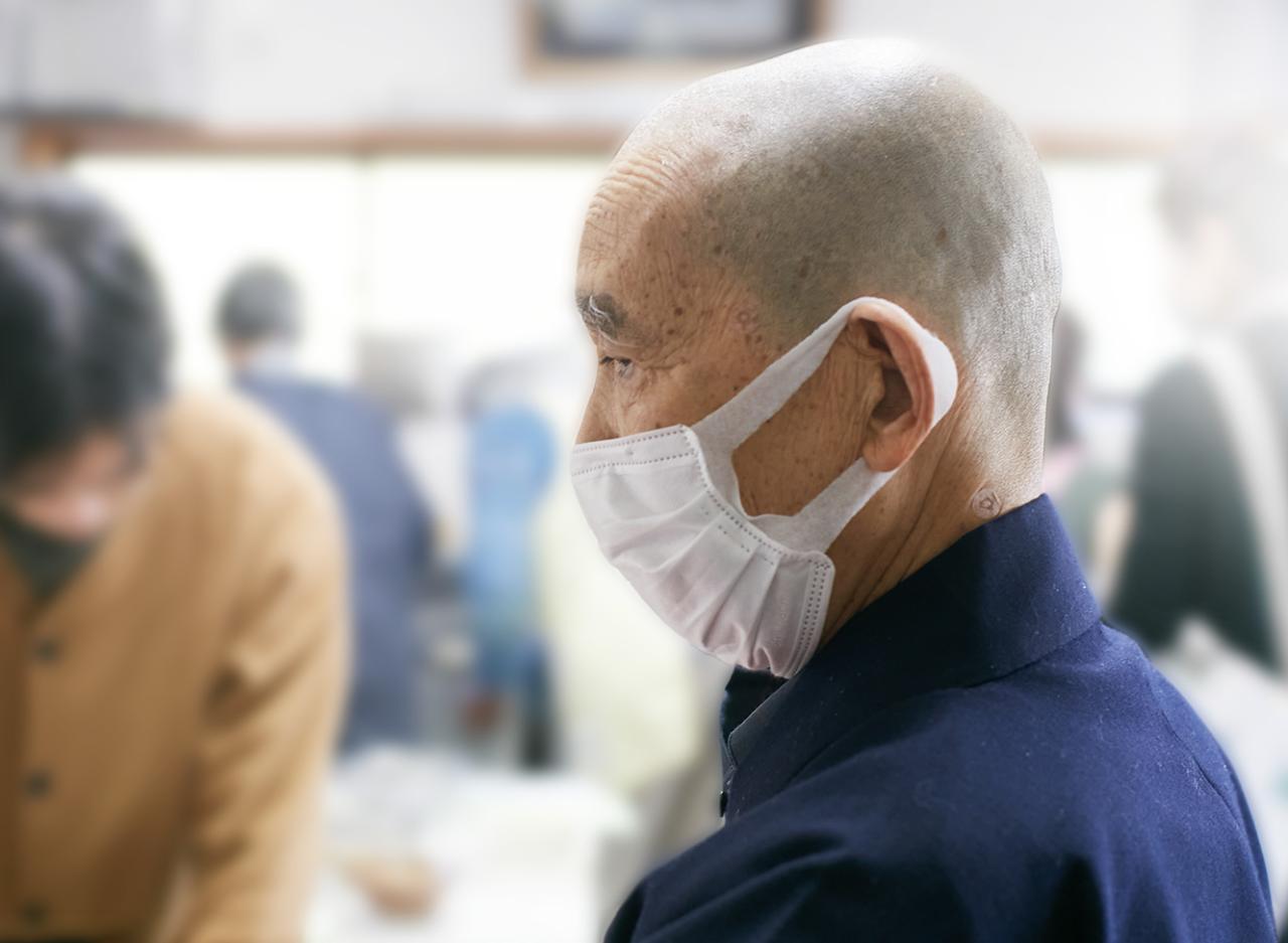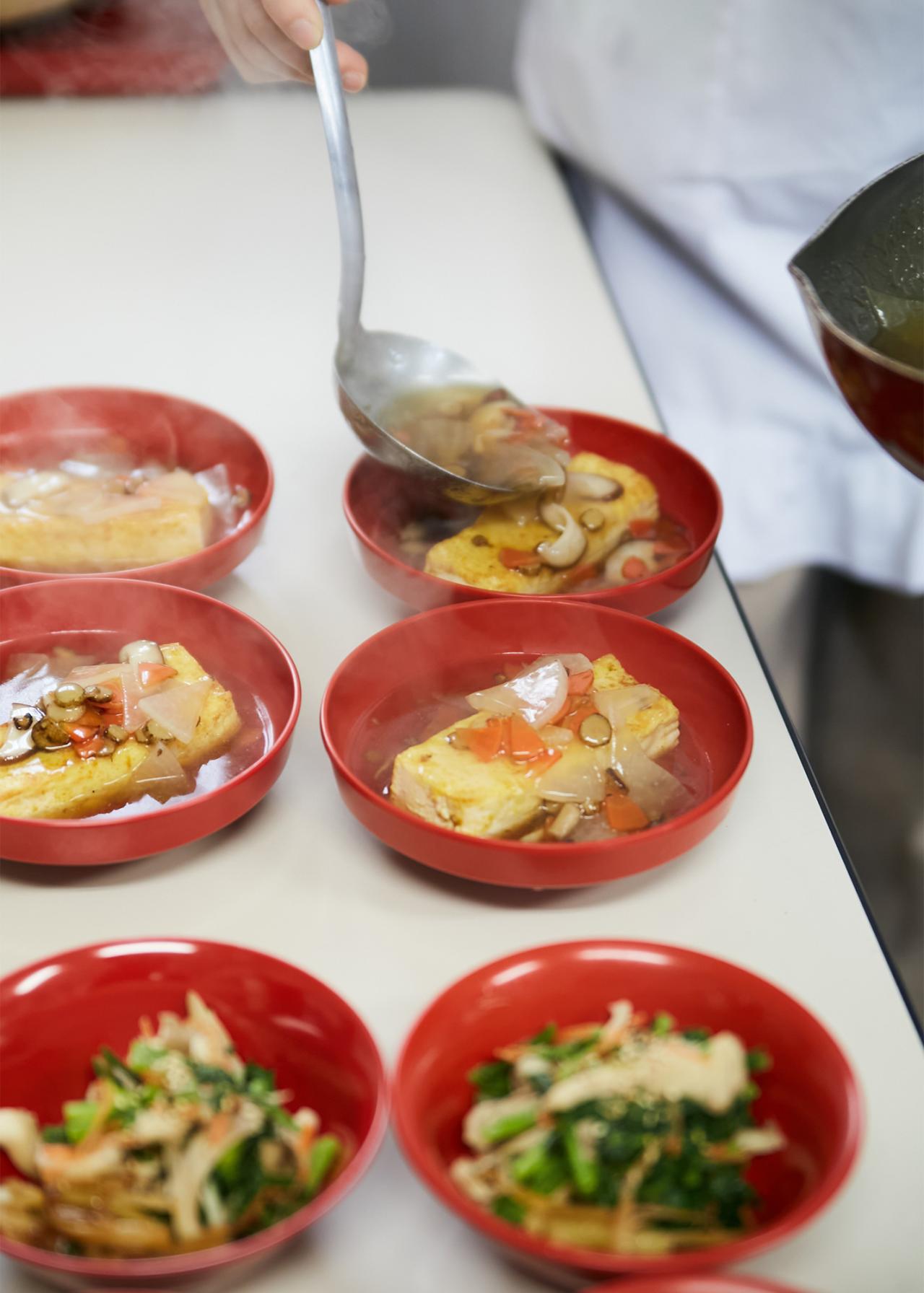 家庭でも取り入れやすい精進料理を学ぶことができると人気で、リピーターや遠方からの参加者も多いこちらの料理教室。調理は〈東林院〉の厨房である「添菜寮(てんさいりょう)」で行う。今日の献立は「揚げうどんのカブラ蒸し」、「カレー豆腐のあんかけ」、「春菊とマイタケのゴマ酢和え」の3品。旬の食材を使った料理や、冬ならではの体が温まる料理が選定された。まずはお茶をいただきながら、西川住職より3品の作り方や精進料理の心得などを聞く。