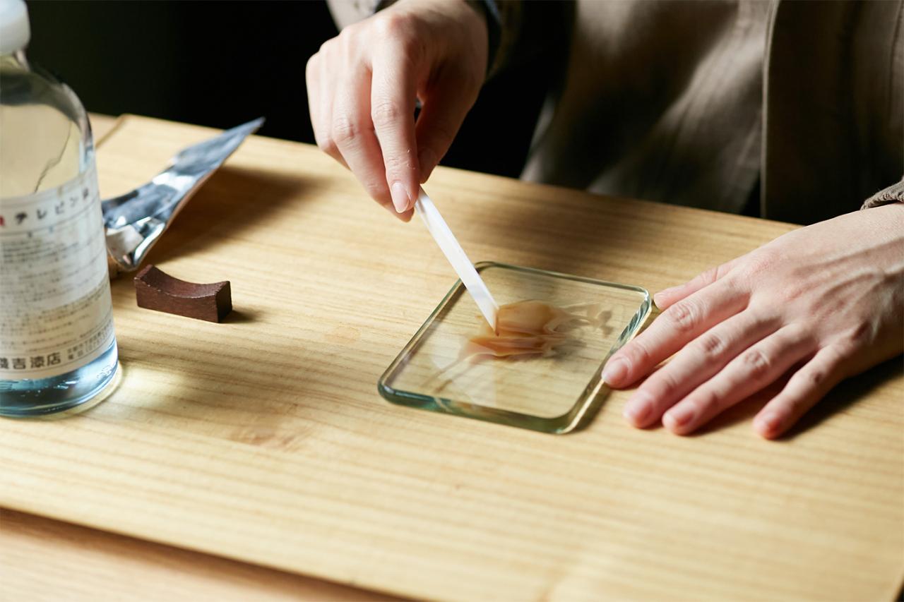 「小麦粉のグルテンを活かしたいので、8の字をかくイメージでこねて粘り気を出していきます。目指すはピザ生地くらいの粘度。同量の生漆と混ぜ合わせたら、麦漆の完成です」