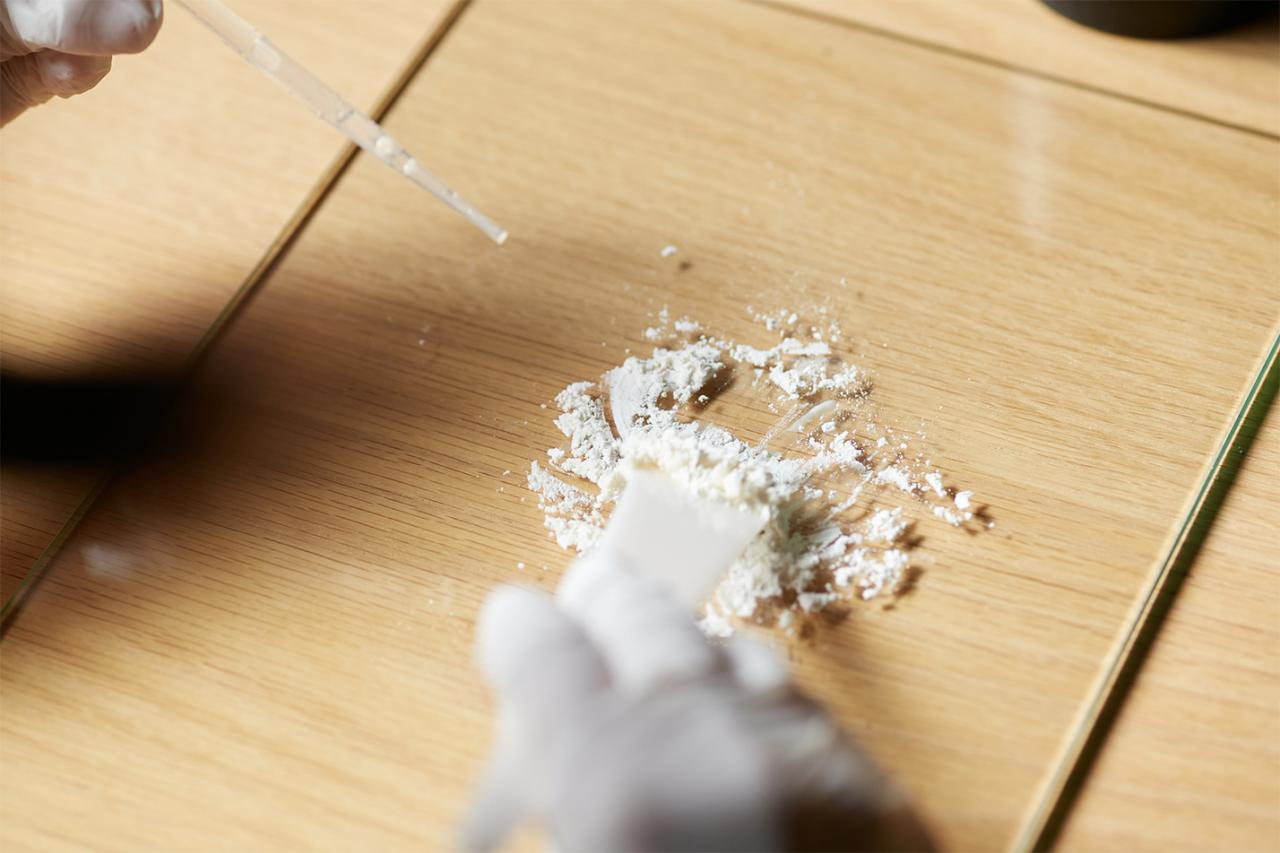 続いて生漆(きうるし)をテレピン油で希釈したものを、欠片の断面、ヒビ、かけている部分に塗っていく。漆は肌につくとかぶれてしまう恐れがあるため、ここからの作業は手袋が必須。内側から外側の順番で作業すると、余計なとこに漆がつきにくくキレイに塗れる。