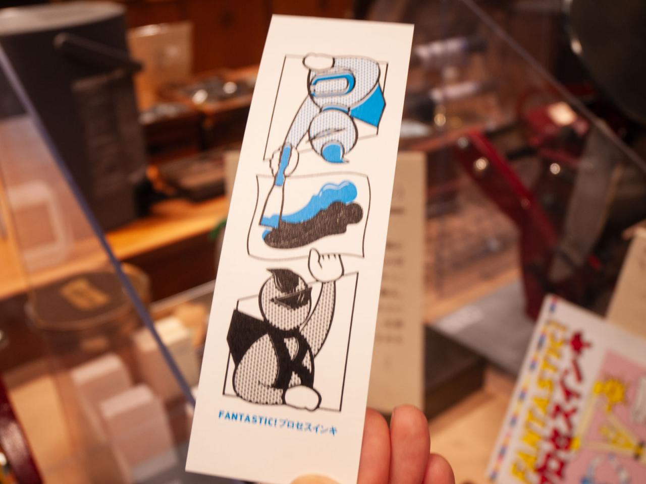 インクをローラーで練りながら版に移し、短冊状の紙がのった板を版にぐっと押し付けて印刷ができます!実際に体験すると、いろいろ作ってみたくなってきます。あんな名刺やこんなカードや…と妄想は膨らむのですが、この施設はあくまで博物館的な役割で、実際に印刷を発注することはできません。代わりに…というわけではないとは思いますが、素敵なグッズがいろいろ販売されていました!