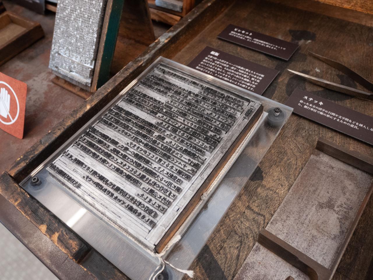 中に入ると、まさに「印刷所」そのもの。かつての印刷工場を一部再現しているということで、活字棚がズラーっと並んでいる風景は、当時を知っているわけでもないのに何だか懐かしい気持ちに。立派な印刷機も鎮座していて、制作現場の様子がうかがえます。