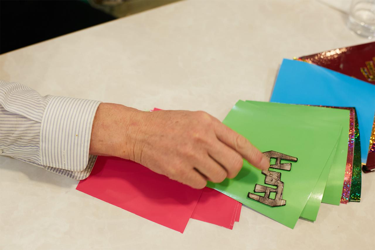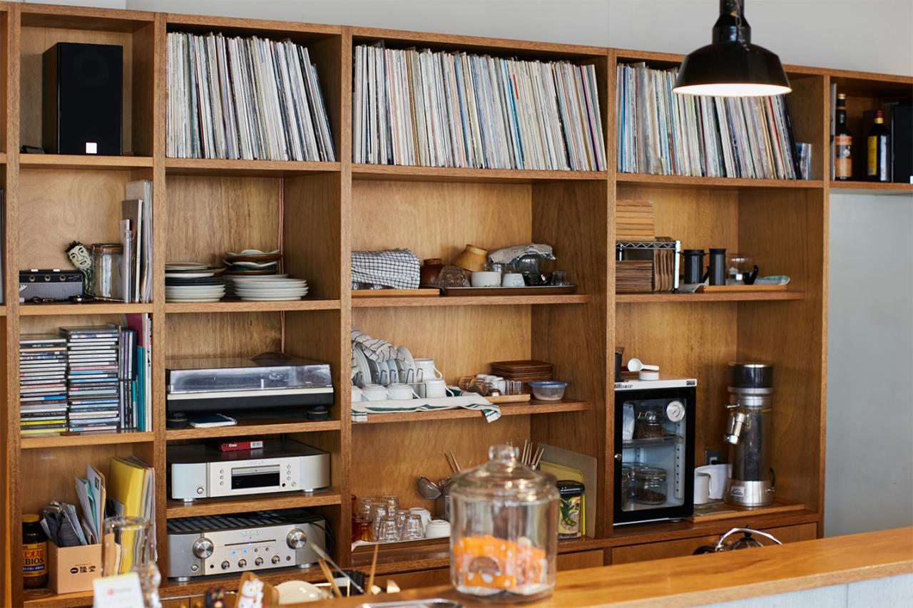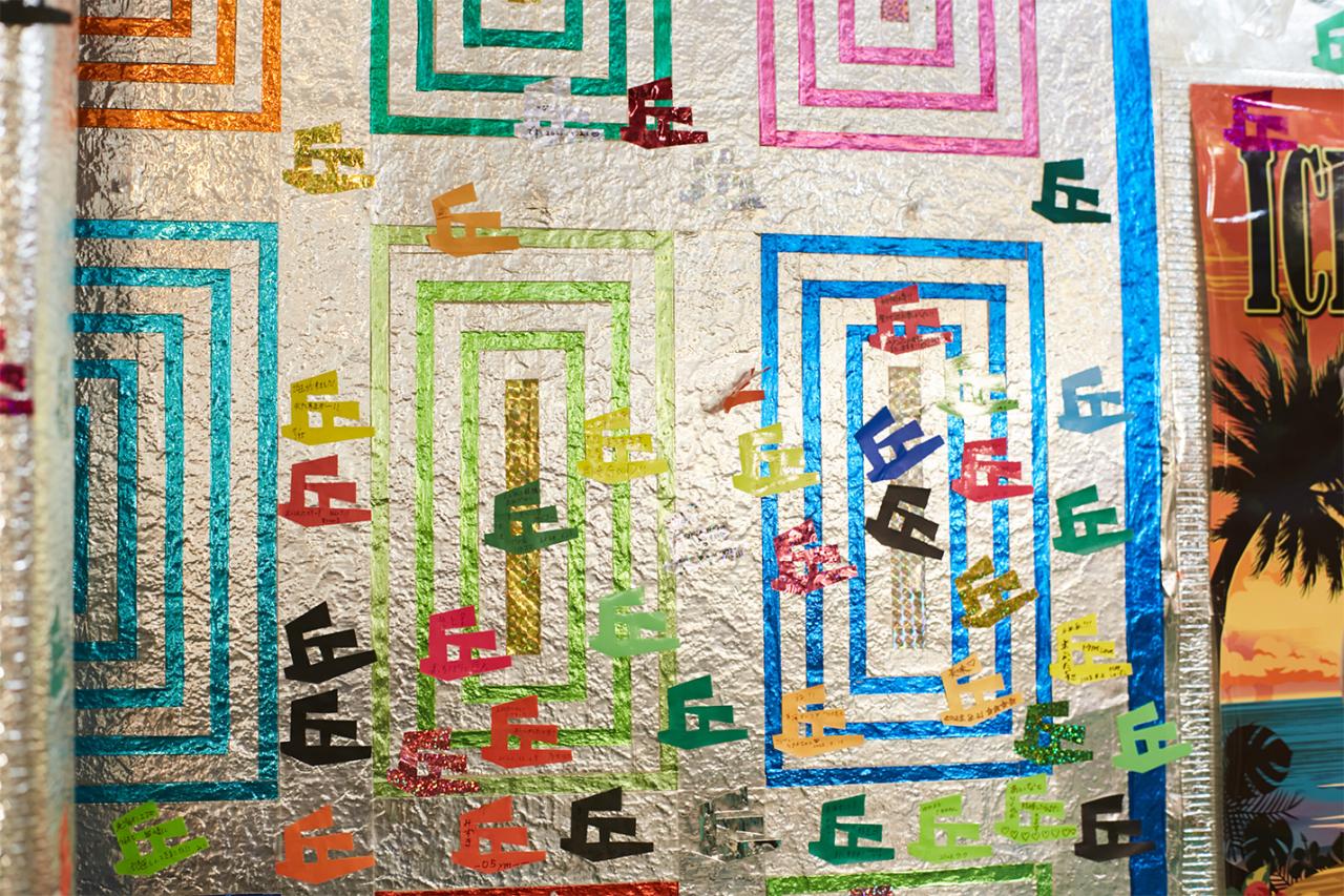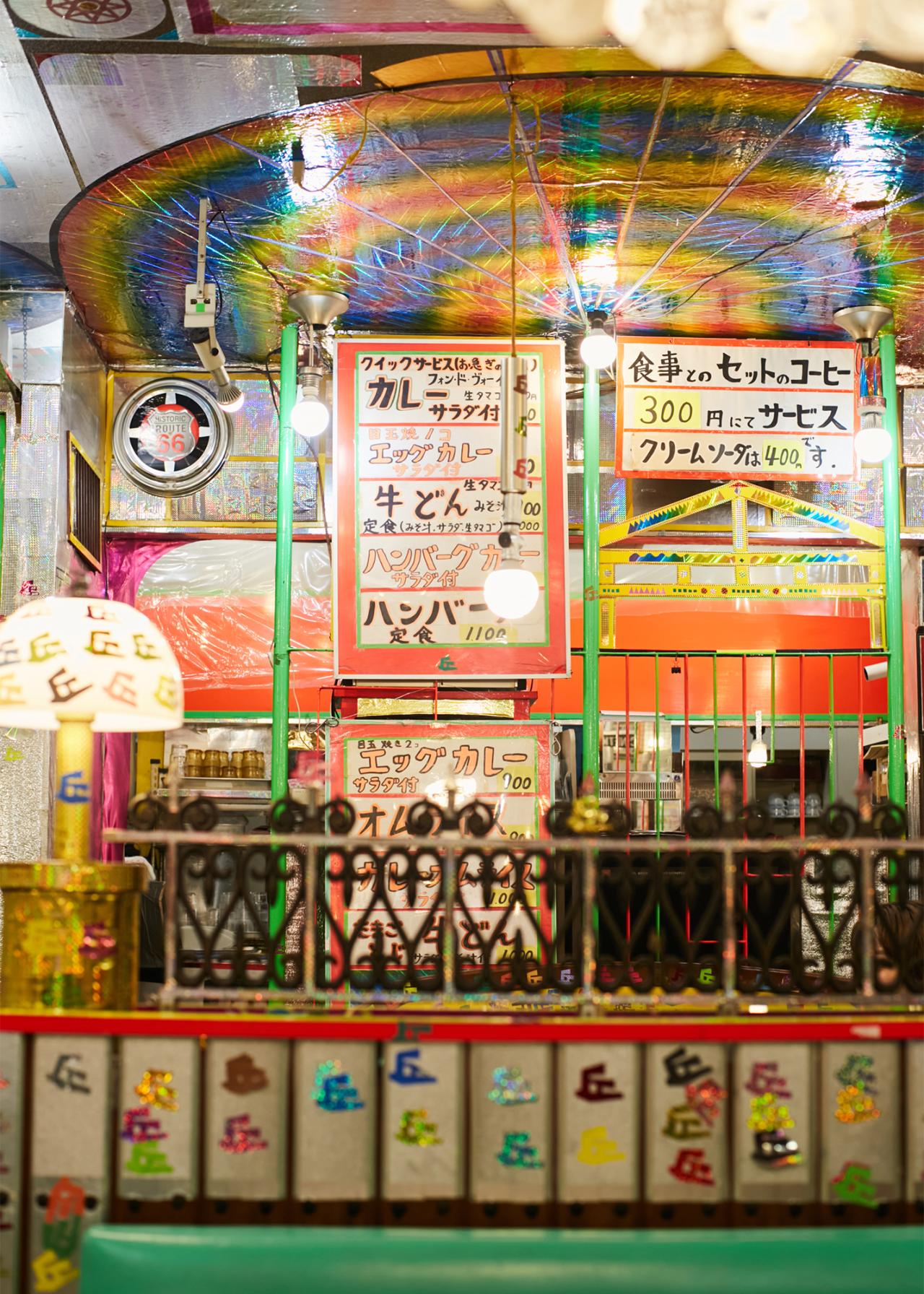 マスターの藤原さんによると、このカラフルな内装は「あいちトリエンナーレ」の映像で店内の装飾を行うお店を見たことがきっかけだという。内装は手作業で行われていて、「丘」のロゴステッカーもすべて手づくり。もともと黒一色だったステッカーを、お客さんの要望でカラフルな用紙に変えたところ学生を中心に流行したのだとか。