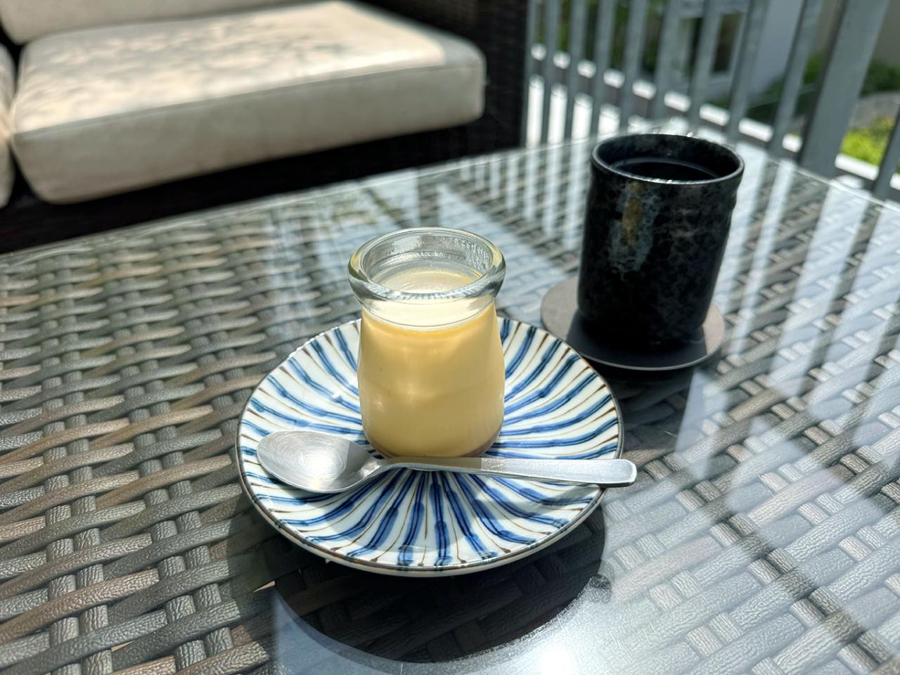デザートはテラス席で徳川苑濃厚プリンをいただきました。北海道産生クリームを使用したプリンは濃厚で口溶けがよく絶品です。