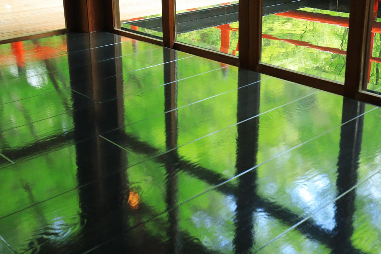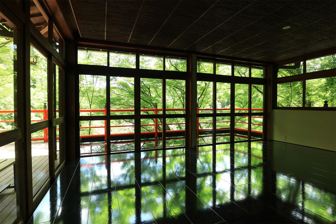 テラスの一角に目を移すと、「水面鏡(すいめんきょう)」と名付けられた水盤に映る緑も美しい。ふと、「水面に赤いモミジの葉が舞い散る頃も良さそうだ」、という思いが沸き起こった。訪れるたびに、きっと新たな印象を抱くに違いない。季節だけでなく時間帯や天候を変えて、改めてこの“特等席”を訪ねてみたい。現在、閑坐の利用には事前予約の必要も、利用時間の制限もないという。しかし今後、注目を浴びることは想像に難くなく、それらのルールも変更される可能性があるそう。まずは今のうちに、由緒ある古刹に誕生した癒しの絶景スポットを訪れてみてはいかがだろうか。