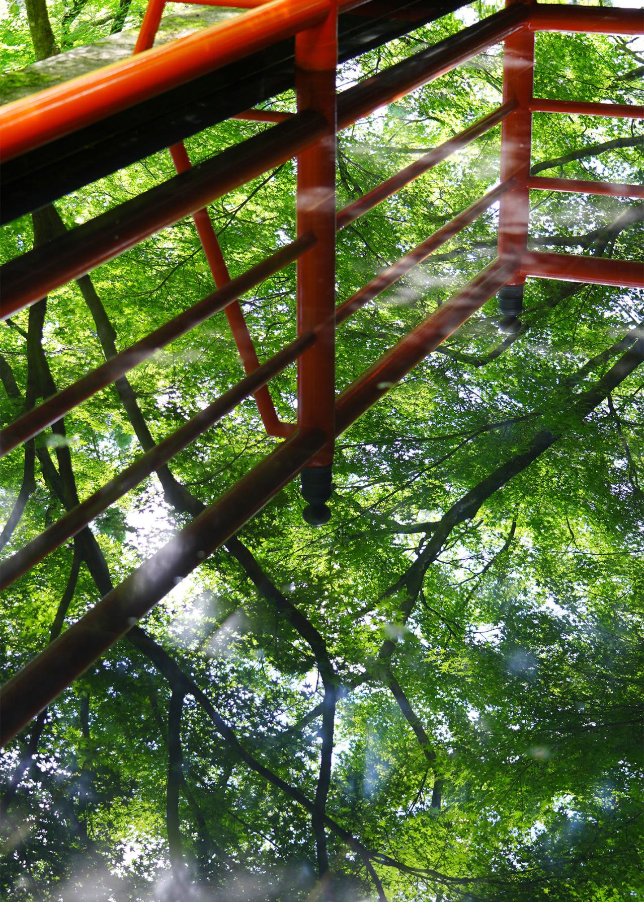 境内にある渓谷にはモミジが約2,000本植えられ、臥雲橋から望む通天橋は“定番風景”といえるだろう。通天橋では、橋の上からモミジの大海原を眺めるのも良いが、緑の海底に沈んだかのように、庭の中に身を置いて仰ぎ見るのもおすすめだ。