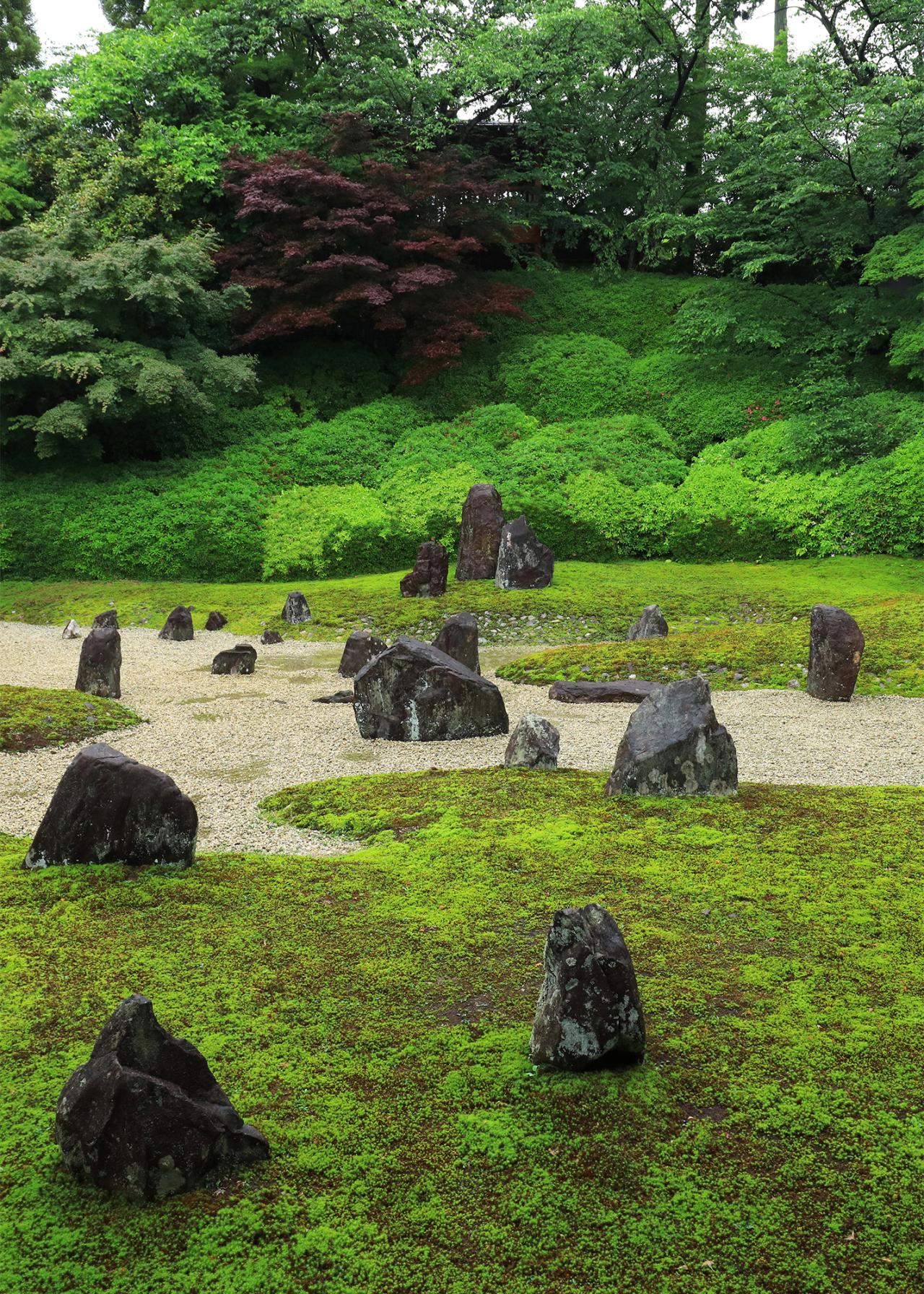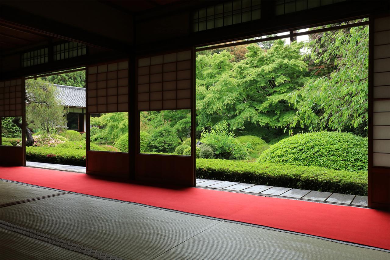 境内の中央を占める波心庭は、東福寺本坊庭園と同様、重森三玲の作庭によるもの。多く配された巨石に目を取られるが、緩やかな傾斜と曲線で描かれた苔と、丸みを帯びたサツキとツツジの刈込みから感じられるのは優しい印象。禅寺の庭というと少し気難しい印象もあるが、涼し気に揺れる青もみじとも相まって、心安らかに眺めることができるお庭だ。