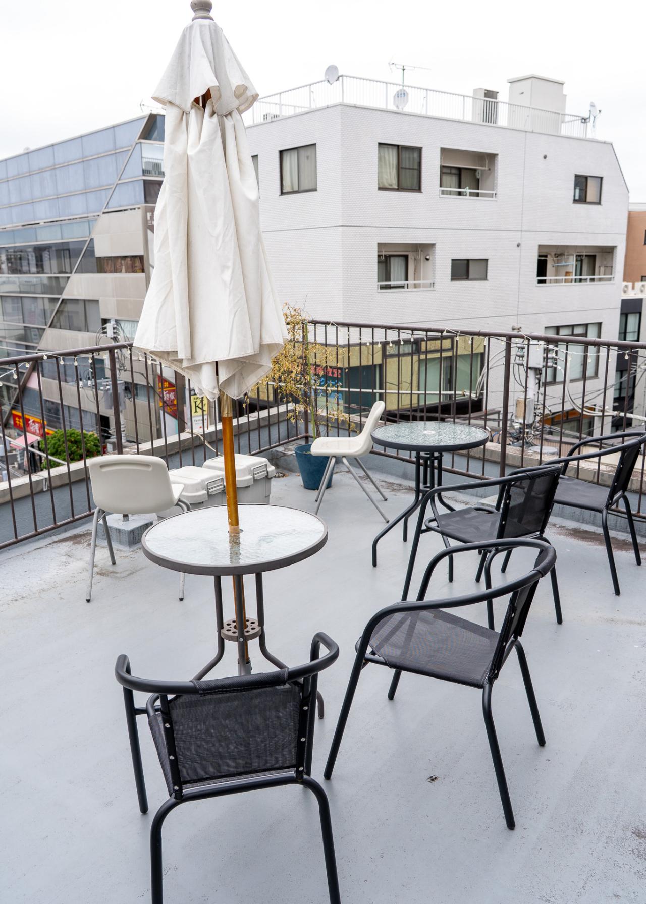 階段を上った先には屋上と小さなアトリエがある。アトリエは展示スペースにもなるほか、アトリエとして貸し出したり、展示する作家の公開制作室になったりなどさまざまな用途で使用されている。屋上は休憩スペースになっていて、本やドリンクを買って利用することも可能。ここで見られる夕焼けを楽しみに訪れる方もいるそう。屋上から三軒茶屋の街並みを眺めながら、穏やかで特別な時間が過ごせる。
